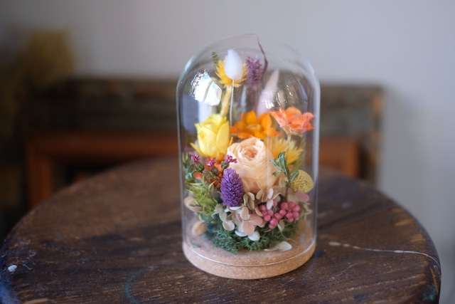 ガラスのドームの中にプリザーブドフラワーフラワーをぎゅっと閉じ込めたようなアレンジです。 ガラスの中にお花があるため、埃などのお手入れもしやすいと好評です。 【サイズ】 器のサイズ直径10センチ×高さ16センチ ☆ご注文、ご入金確認後の発送のため、お支払方法がお振り込みの場合到着まで日数が、かかる事が、ございます。日数に余裕を持ってご注文下さい。 ご購入の際の注意点 プリザーブドフラワーは生花を保存加工することで、その柔らかな風合いや形を長く楽しめるようにしたものです。まるで生花のような風合いですが、プリザーブドフラワーを使用しているため長く楽しんでいただけます。ただ、自然の素材ですので2~3年ほどで花弁にヒビが入り、お色も退色してきます。そんな移ろいゆく様も自然素材の面白さとして楽しんでいただけたらと思います。 ☆自然素材のため一つ一つ花の形が異なります。また花びらの欠けやヒビが入っていることもございます。ご了承のうえ、ご注文下さい ☆湿度の高い時期などにまれに葉から色が染み出ることがございます、お洋服への色移りにご注意ください。 ☆(置き場所や素材により異なりますが)2~3年楽しめるといわれていますが、徐々に色や風合いは変化します。 ☆直射日光にあてる退色が早まります。長く楽しんでいただくために、直射の当たりにくい場所にお飾りください。 ☆デリケートなお花です。優しく扱ってください。 ※梅雨時など、花びらが透けたようになる場合がござ います。 その際は、乾燥剤を入れた箱などにいれ、湿度を下げると元に戻ります