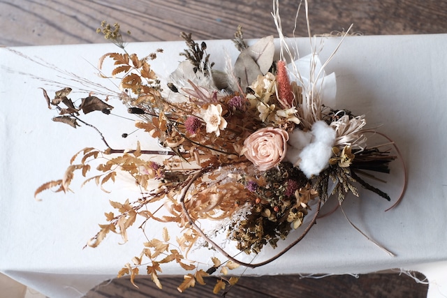 こちらの商品はプリザーブドフラワーやドライフラワーを組み合わせた スワッグになります。 壁にかけたり、棚に置いたりといろんな飾りかたを楽しんでいただけます。 【サイズ】 長さ約43センチ×幅約30センチ ≪使用花材≫ プリザーブドフラワ ドライフラワー ☆ご注文、ご入金確認後の発送のため、お支払方法がお振り込みの場合到着まで日数が、かかる事が、ございます。日数に余裕を持ってご注文下さい。 ご購入の際の注意点 プリザーブドフラワーは生花を保存加工することで、その柔らかな風合いや形を長く楽しめるようにしたものです。まるで生花のような風合いですが、プリザーブドフラワーを使用しているため長く楽しんでいただけます。ただ、自然の素材ですので2~3年ほどで花弁にヒビが入り、お色も退色してきます。そんな移ろいゆく様も自然素材の面白さとして楽しんでいただけたらと思います。 ☆自然素材のため一つ一つ花の形が異なります。また花びらの欠けやヒビが入っていることもございます。ご了承のうえ、ご注文下さい ☆湿度の高い時期などにまれに葉から色が染み出ることがございます、お洋服への色移りにご注意ください。 ☆(置き場所や素材により異なりますが)2~3年楽しめるといわれていますが、徐々に色や風合いは変化します。 ☆直射日光にあてる退色が早まります。長く楽しんでいただくために、直射の当たりにくい場所にお飾りください。 ☆デリケートなお花です。優しく扱ってください。 ※梅雨時など、花びらが透けたようになる場合がございます。 その際は、乾燥剤を入れた箱などにいれ、湿度を下げると元に戻ります