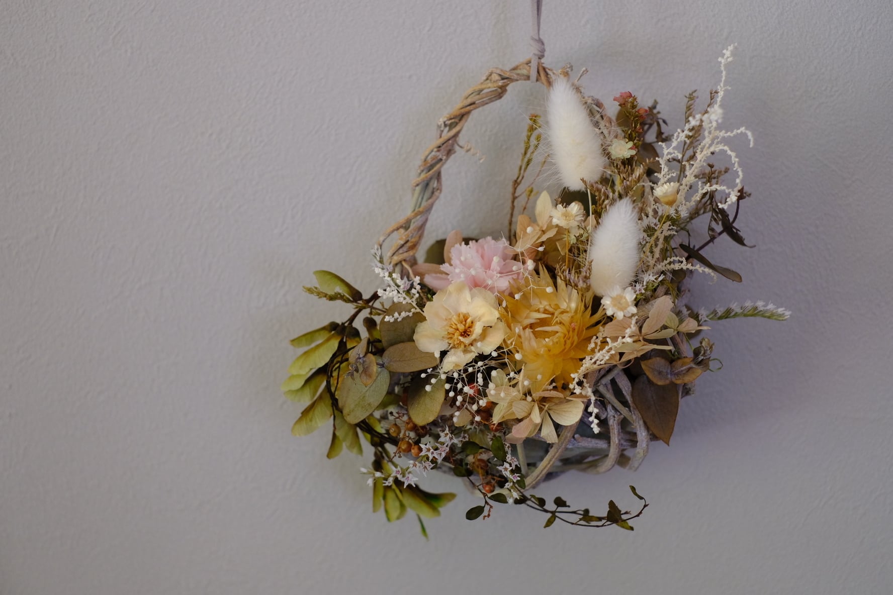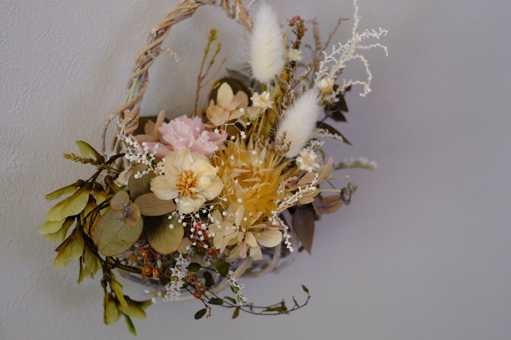 プリザーブドフラワーは生花を保存加工することで、その柔らかな風合いや形を長く楽しめるようにしたものです。まるで生花のような風合いですが、プリザーブドフラワーを使用しているため長く楽しんでいただけます。ただ、自然の素材ですので2~3年ほどで花弁にヒビが入り、お色も退色してきます。そんな移ろいゆく様も自然素材の面白さとして楽しんでいただけたらと思います。