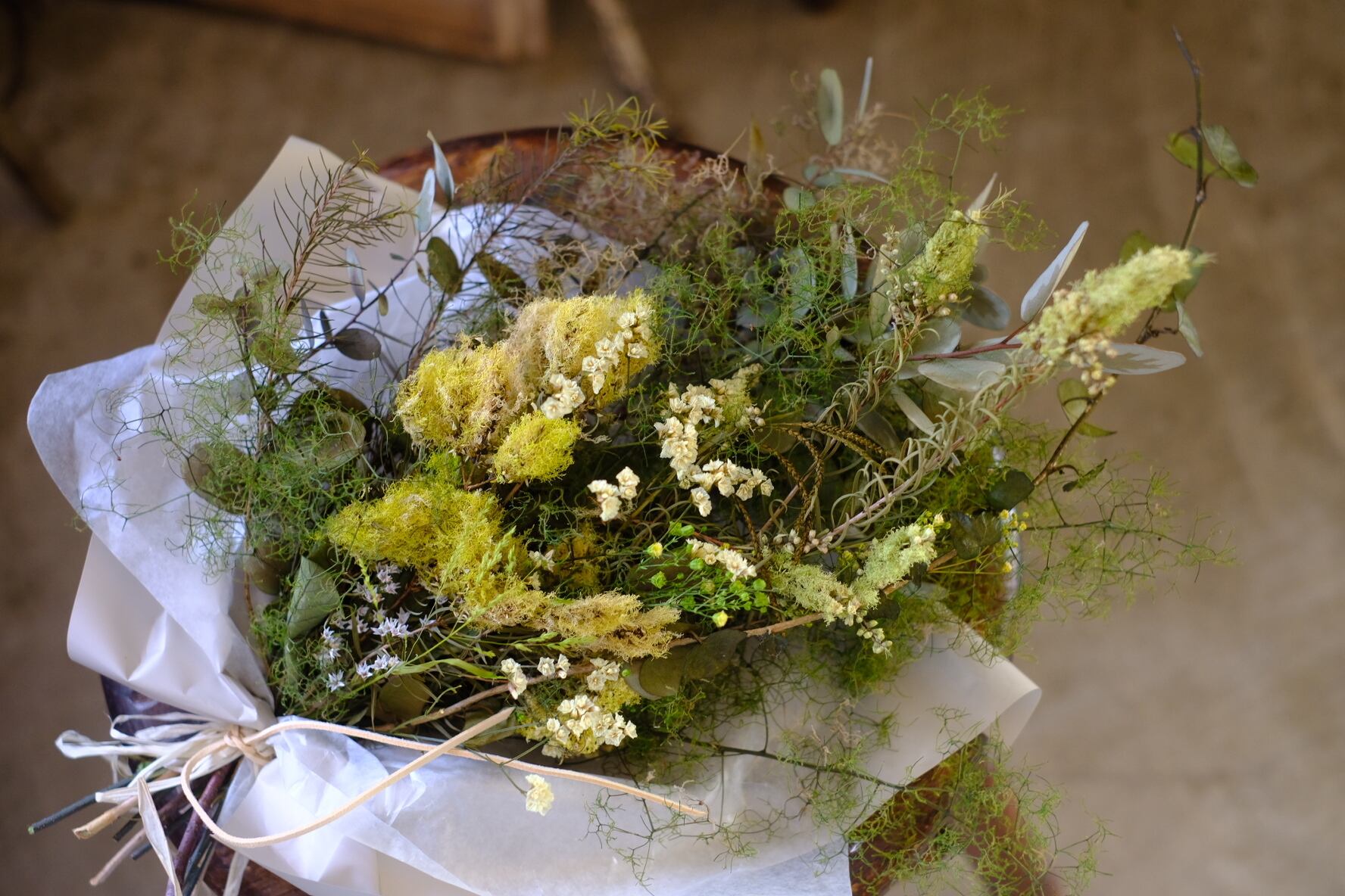 プリザーブドフラワーは生花を保存加工することで、その柔らかな風合いや形を長く楽しめるようにしたものです。まるで生花のような風合いですが、プリザーブドフラワーを使用しているため長く楽しんでいただけます。ただ、自然の素材ですので2~3年ほどで花弁にヒビが入り、お色も退色してきます。そんな移ろいゆく様も自然素材の面白さとして楽しんでいただけたらと思います。