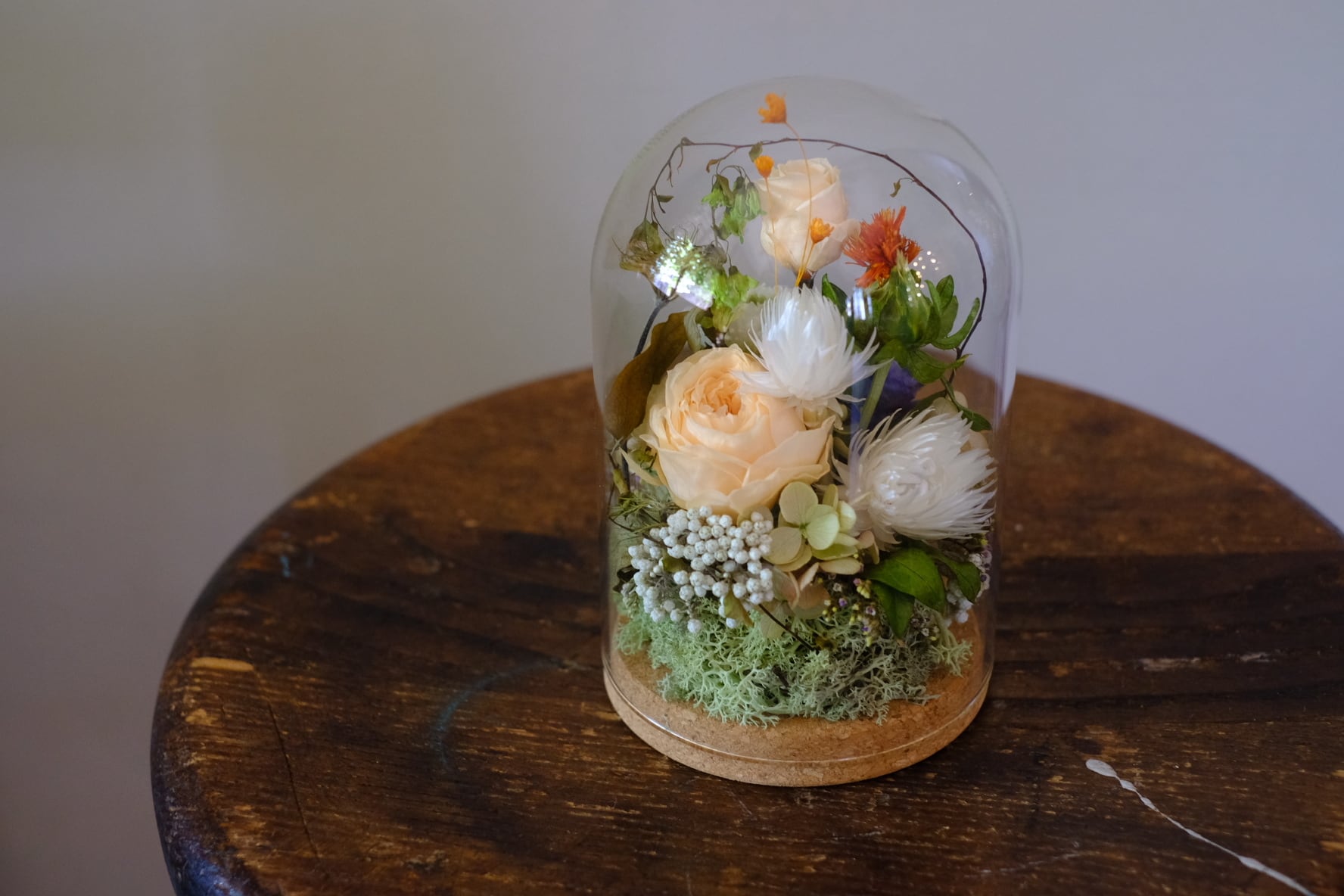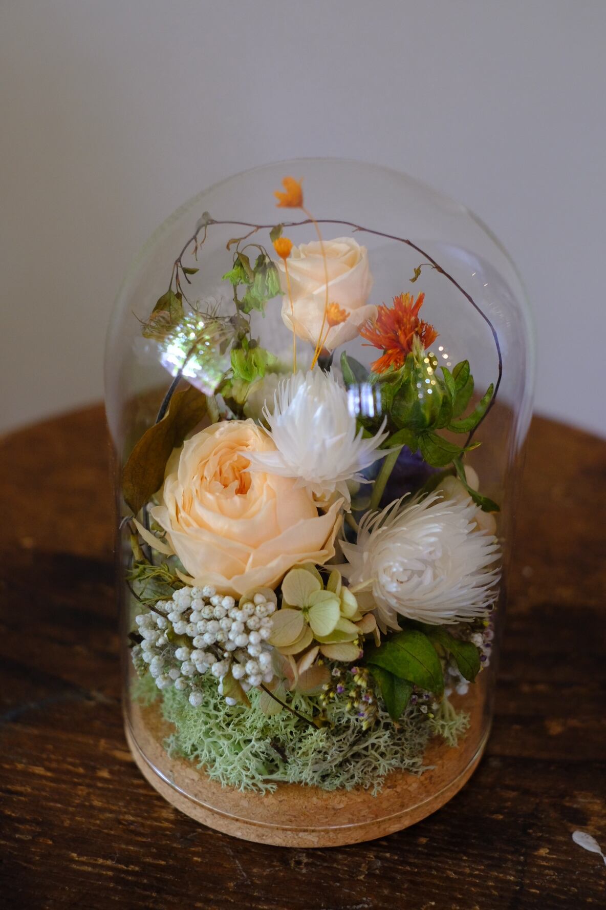 ガラスのドームの中にプリザーブドフラワーフラワーをぎゅっと閉じ込めたようなアレンジです。
