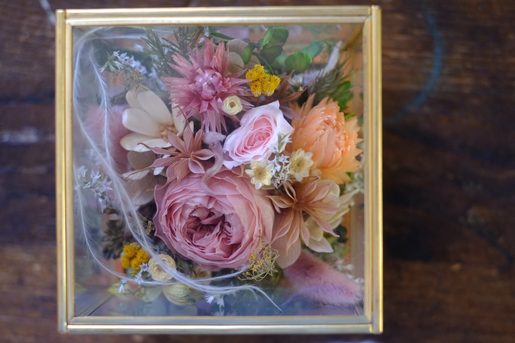アンティークゴールドの縁取りの綺麗なガラスboxにプリザーブドフラワーフラワーをアレンジしました。