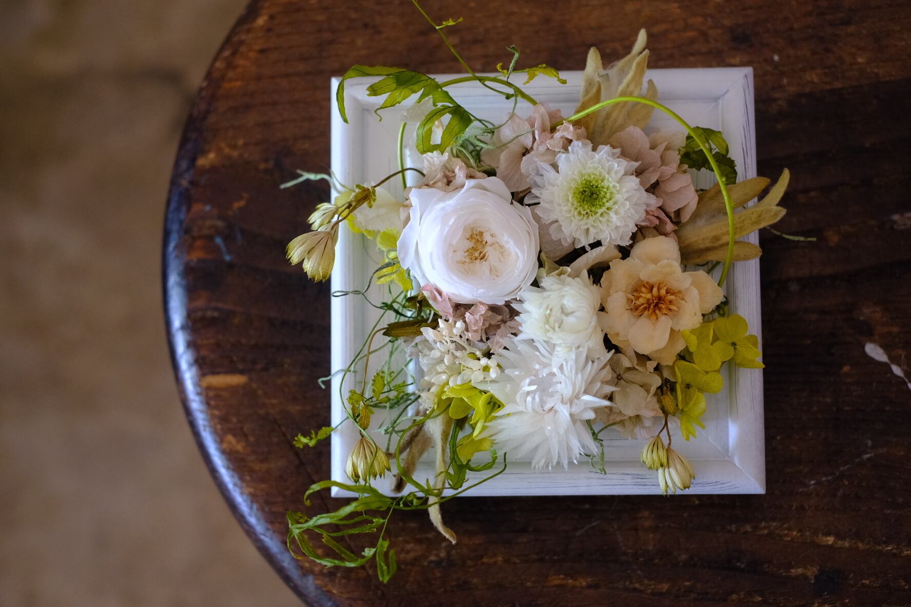 アンティーク調の額にお花をこんもりと添えてアレンジします。