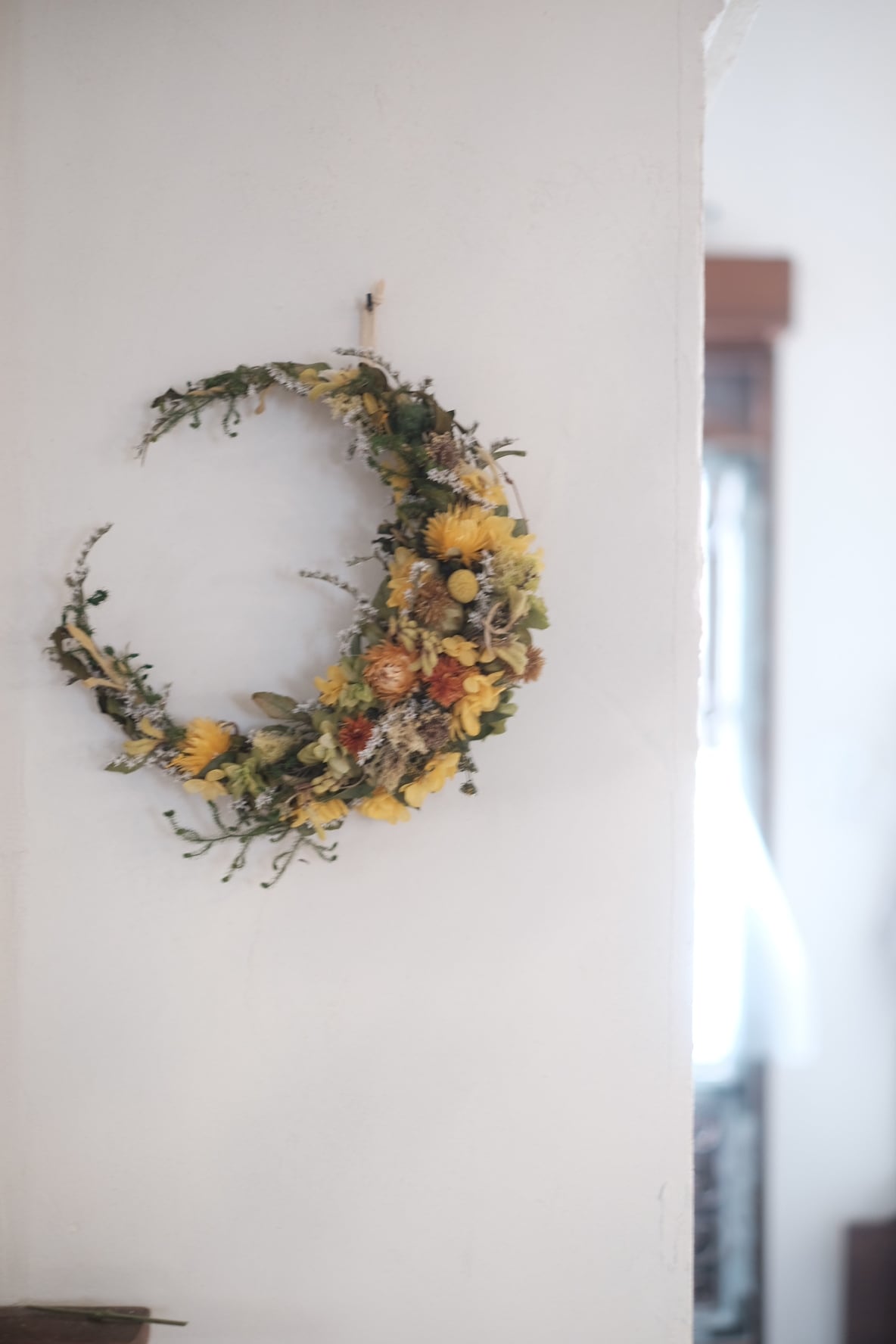 黄色の小花やアジサイ、オレンジの紅花などを組み合わせ、明るく輝くようなイメージの三日月リースです。