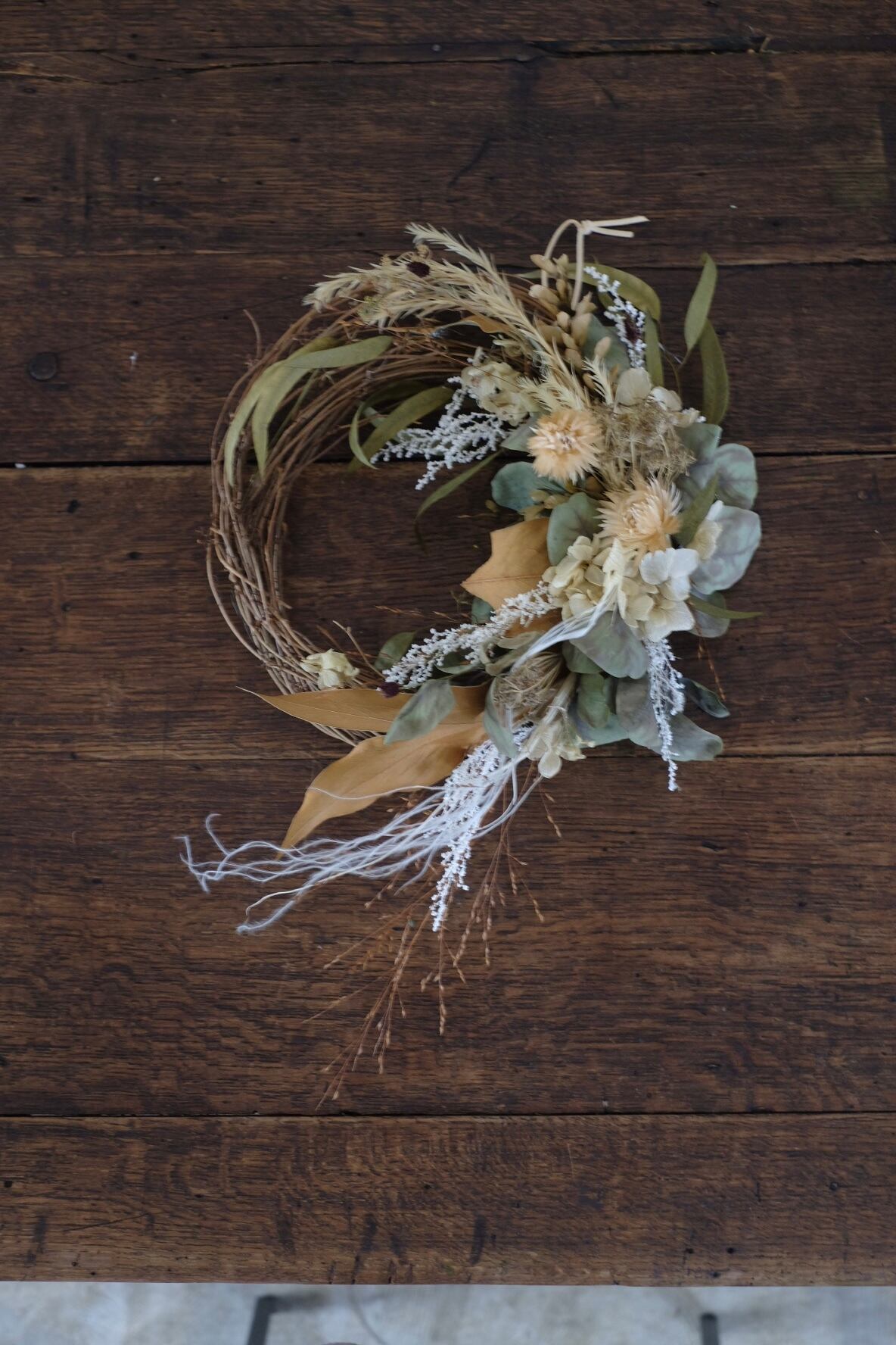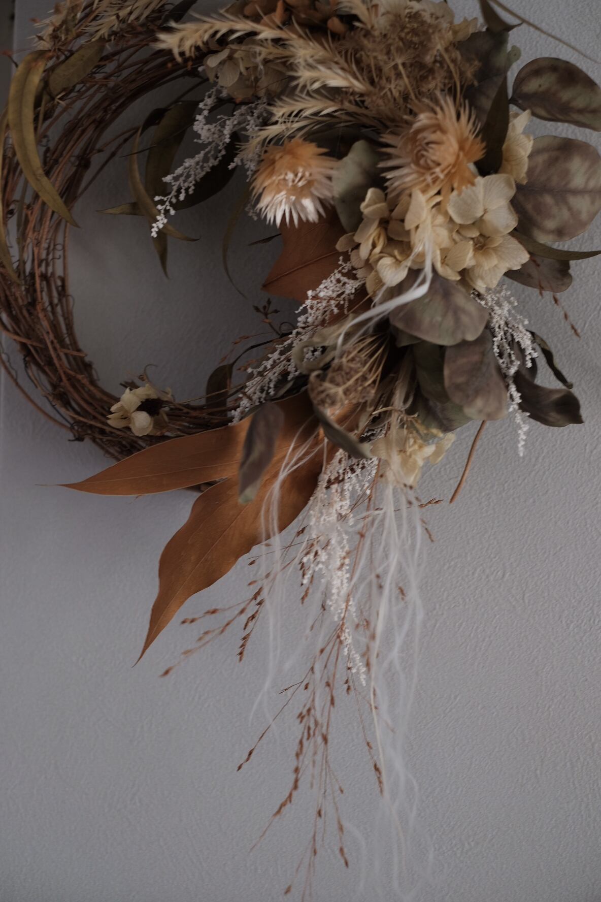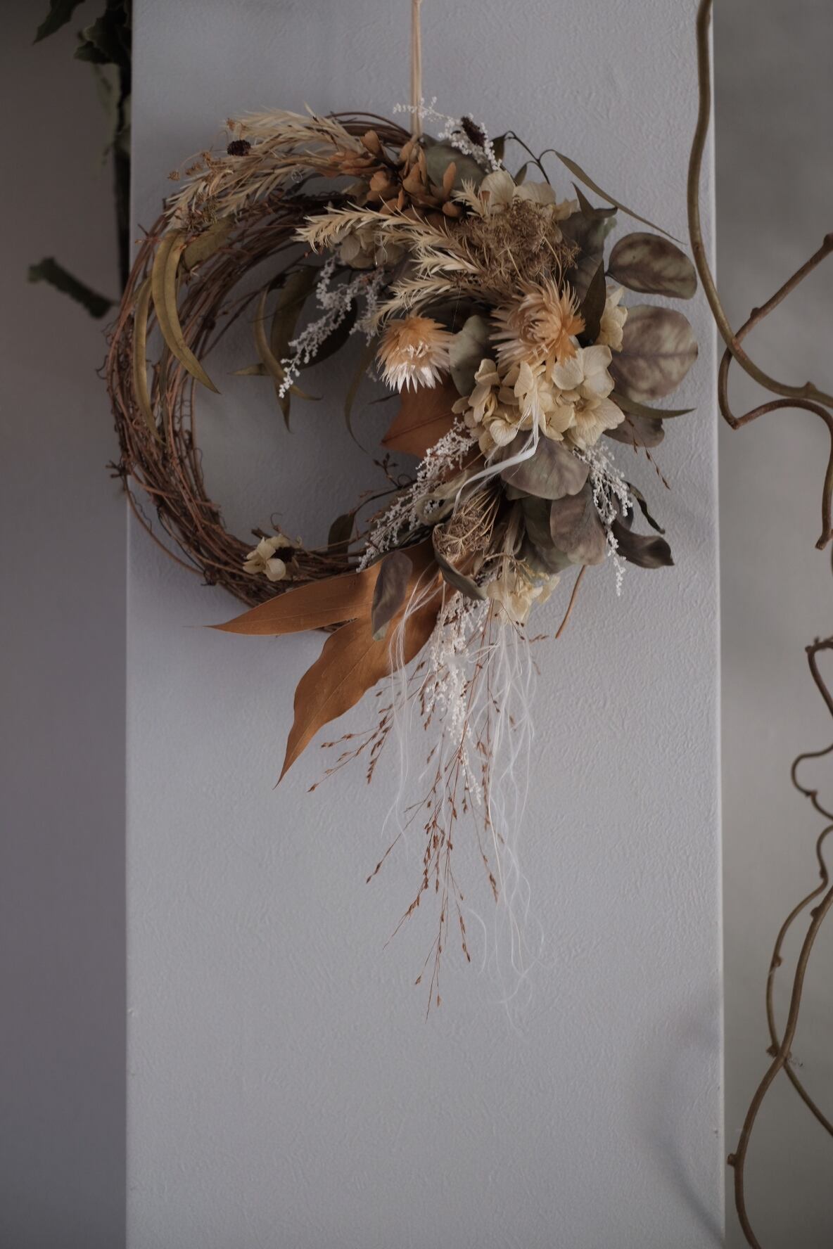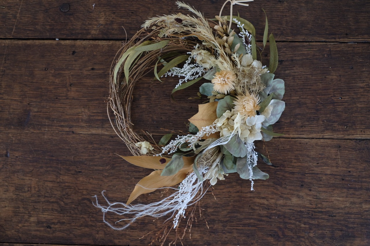 ユーカリなどのグリーンに、ふんわりした色合いのお花を合わせて、優しい雰囲気のリースに仕立てました。