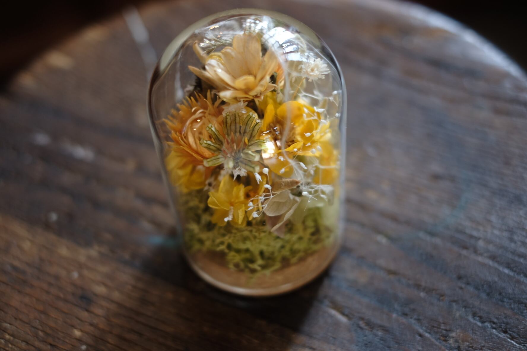 ガラスのドームの中にプリザーブドフラワーフラワーをぎゅっと閉じ込めたようなアレンジです。