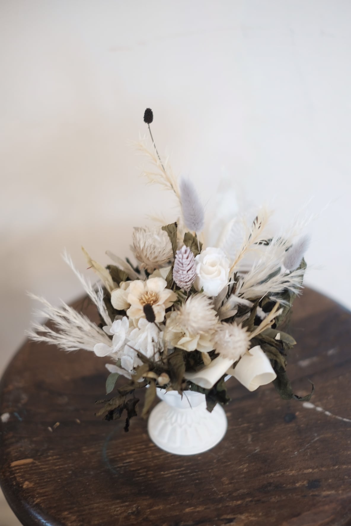 アンティークな雰囲気の器にプリザーブドフラワーのお花をメインにドライフラワーなども混ぜてアレンジしました。柔らかで自然的なイメージなので、ナチュラルなインテリアにも合わせやすいです。