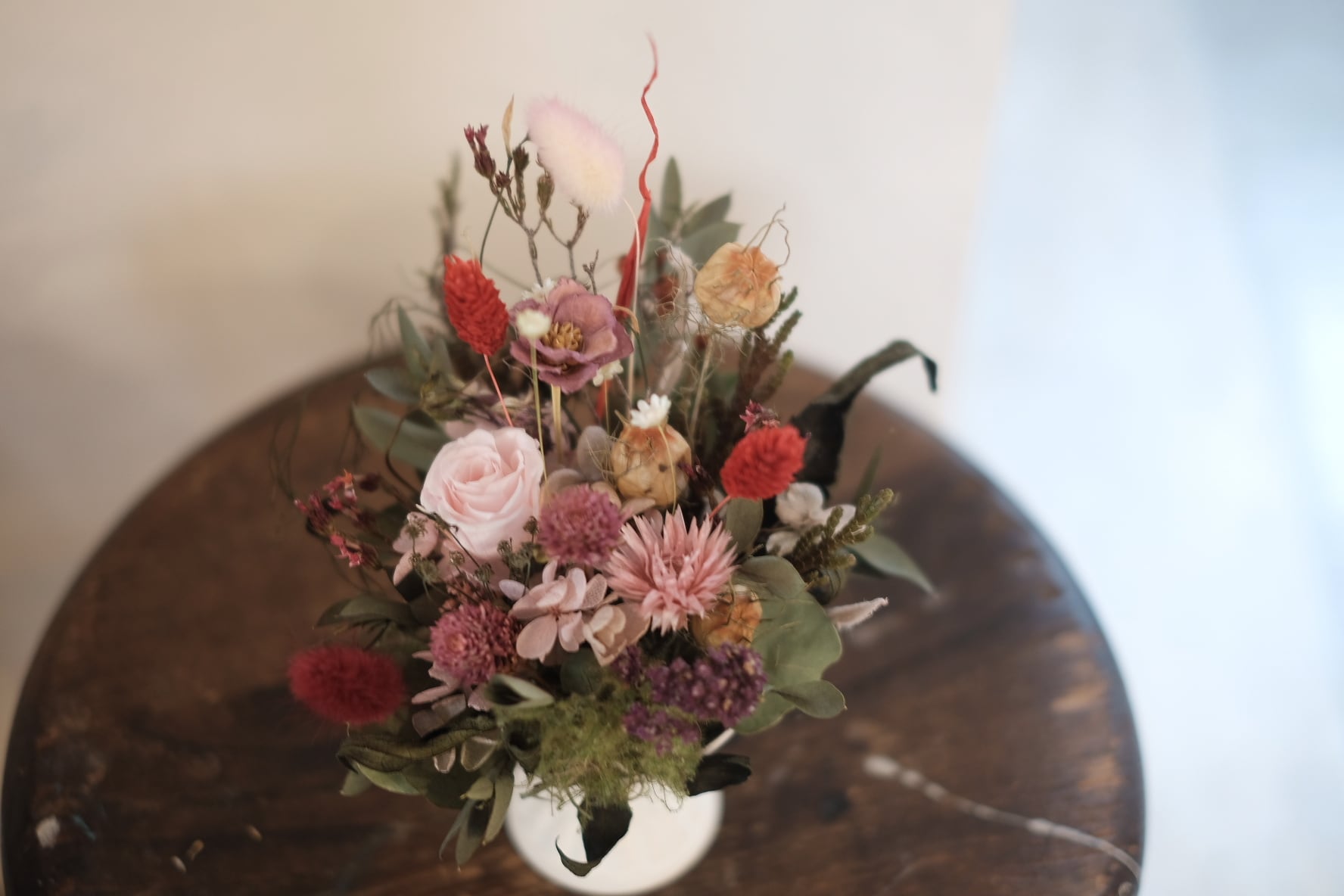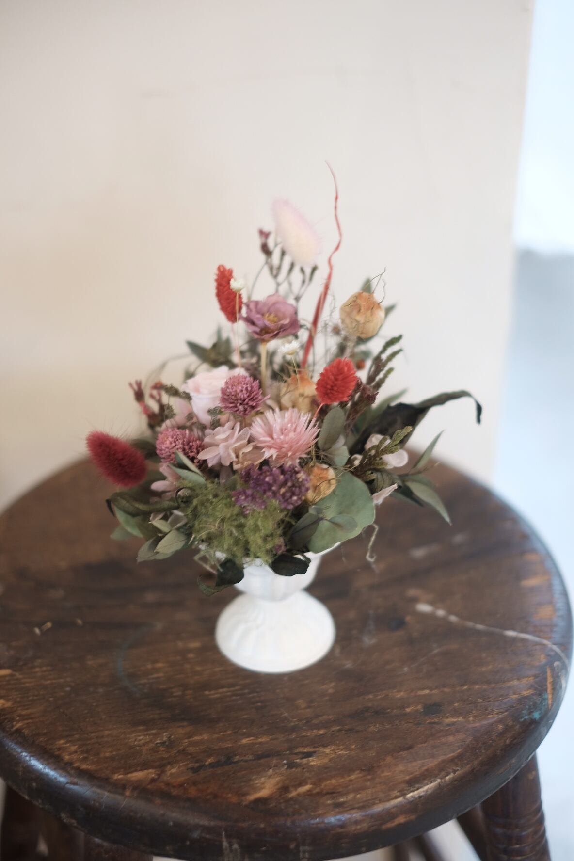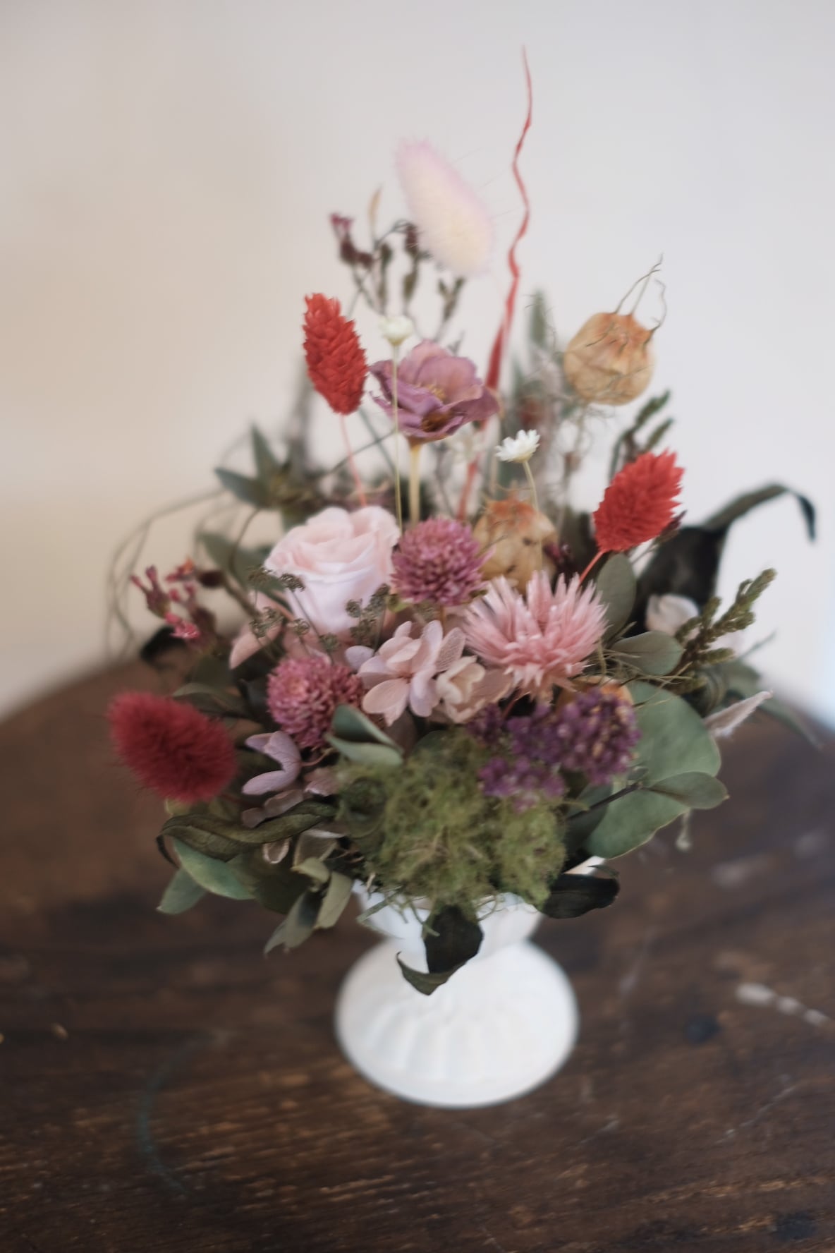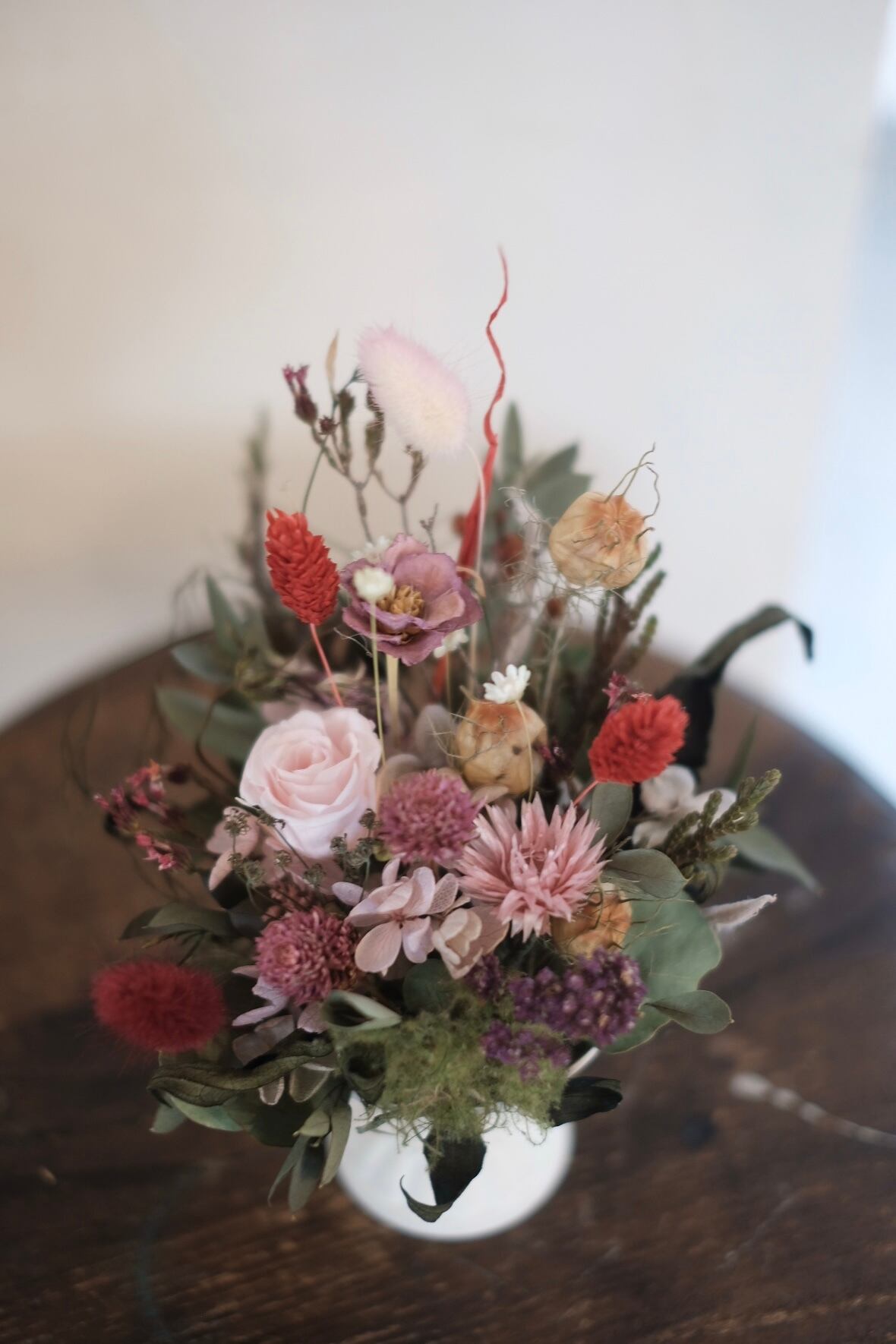 アンティークな雰囲気の器にプリザーブドフラワーのお花をメインにドライフラワーなども混ぜてアレンジしました。柔らかで自然的なイメージなので、ナチュラルなインテリアにも合わせやすいです。