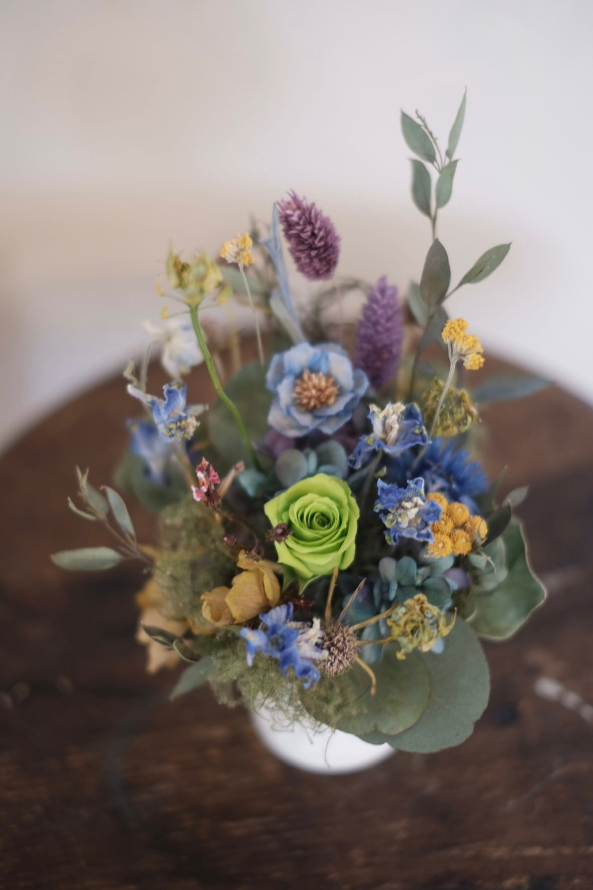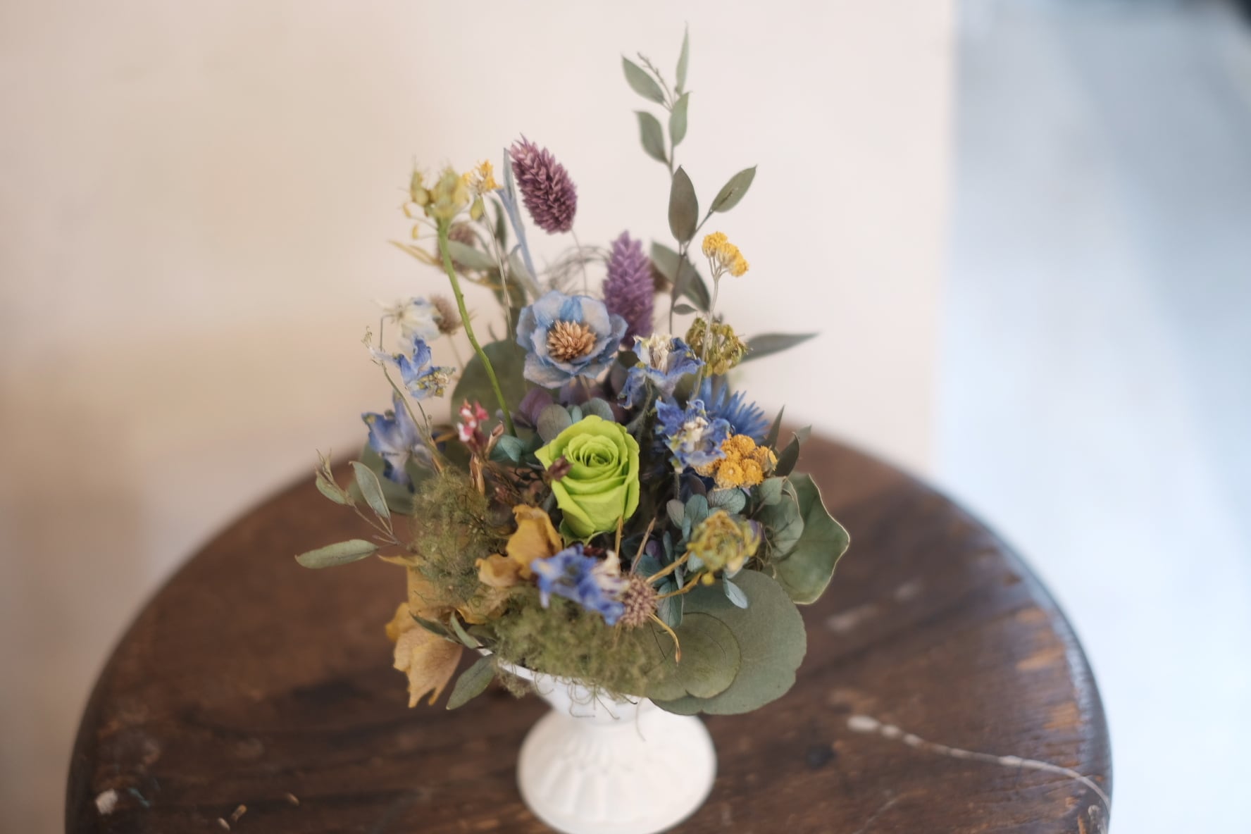 アンティークな雰囲気の器にプリザーブドフラワーのお花をメインにドライフラワーなども混ぜてアレンジしました。柔らかで自然的なイメージなので、ナチュラルなインテリアにも合わせやすいです。