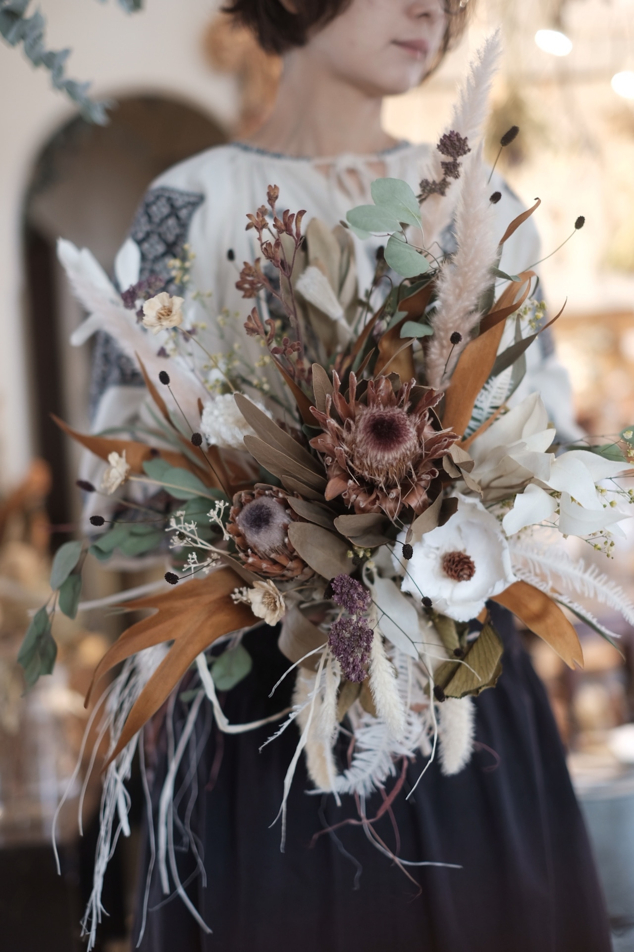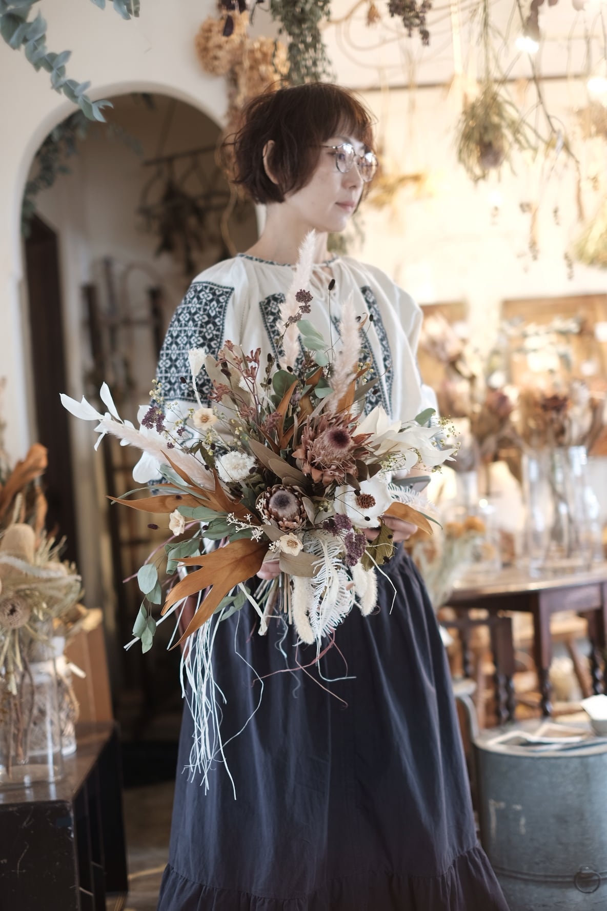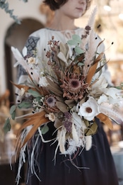 こちらの商品はプリザーブドフラワーやドライフラワーを組み合わせた ウェディングブーケです。