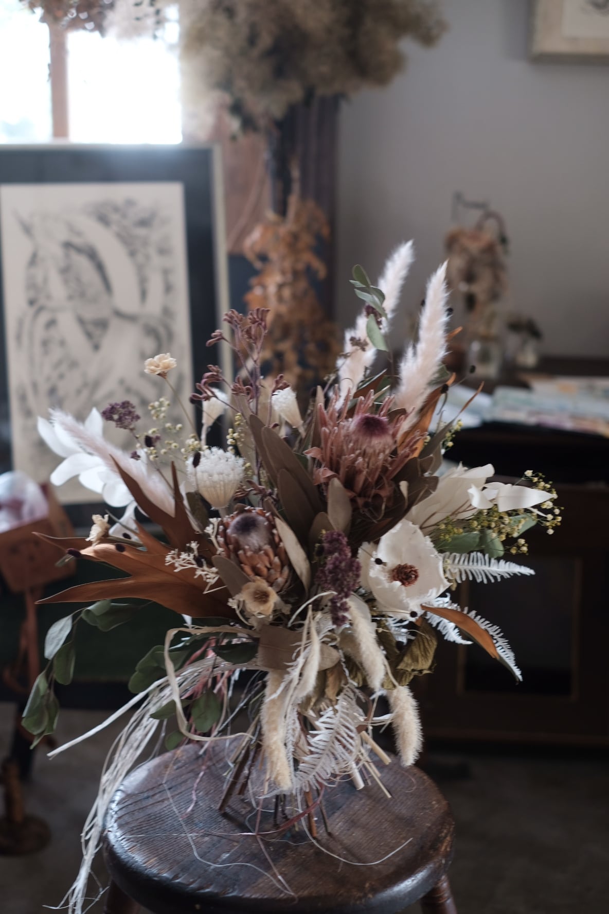 プリザーブドフラワーは生花を保存加工することで、その柔らかな風合いや形を長く楽しめるようにしたものです。まるで生花のような風合いですが、プリザーブドフラワーを使用しているため長く楽しんでいただけます。ただ、自然の素材ですので2~3年ほどで花弁にヒビが入り、お色も退色してきます。そんな移ろいゆく様も自然素材の面白さとして楽しんでいただけたらと思います。