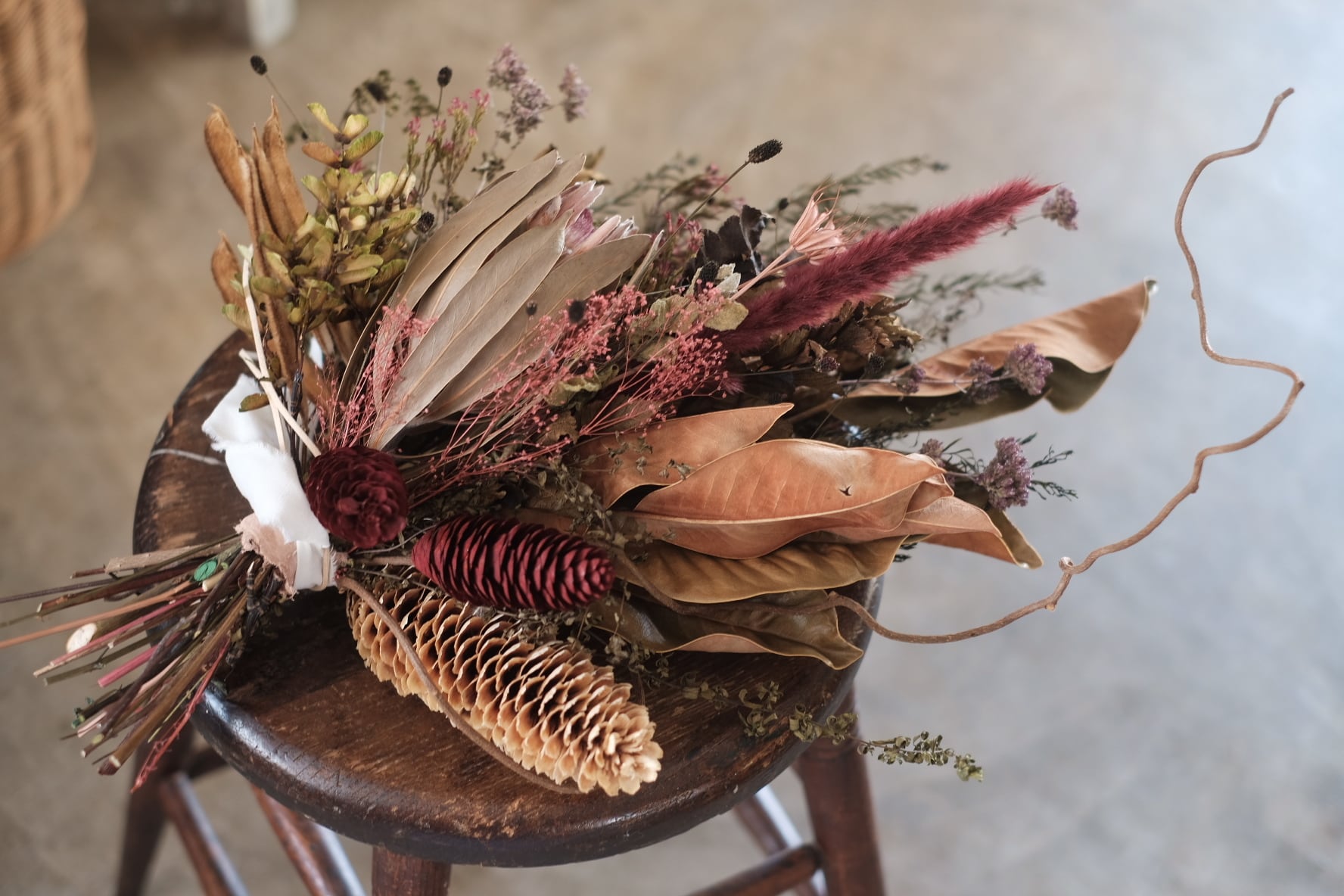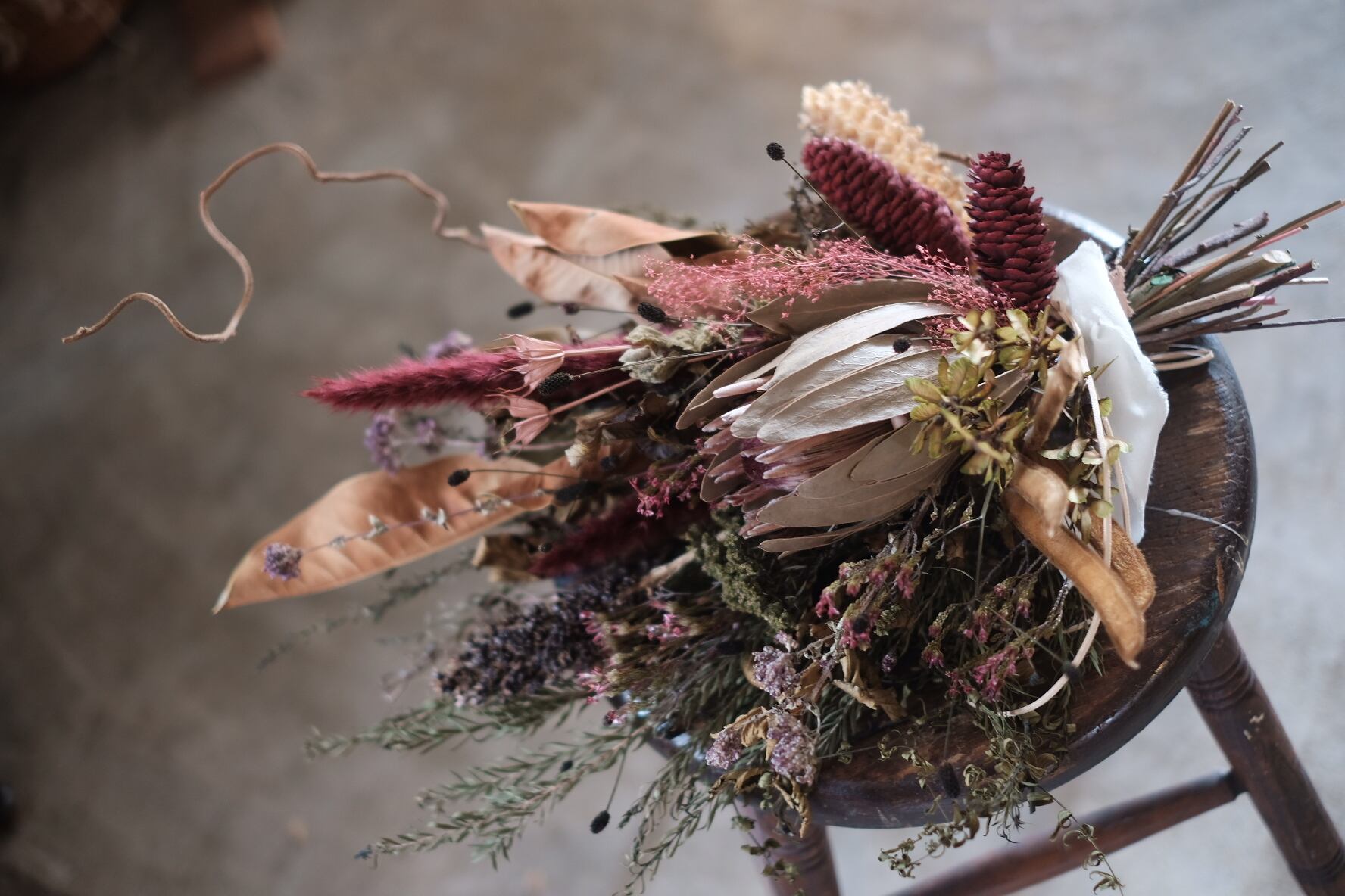 プリザーブドフラワーは生花を保存加工することで、その柔らかな風合いや形を長く楽しめるようにしたものです。まるで生花のような風合いですが、プリザーブドフラワーを使用しているため長く楽しんでいただけます。ただ、自然の素材ですので2~3年ほどで花弁にヒビが入り、お色も退色してきます。そんな移ろいゆく様も自然素材の面白さとして楽しんでいただけたらと思います。
