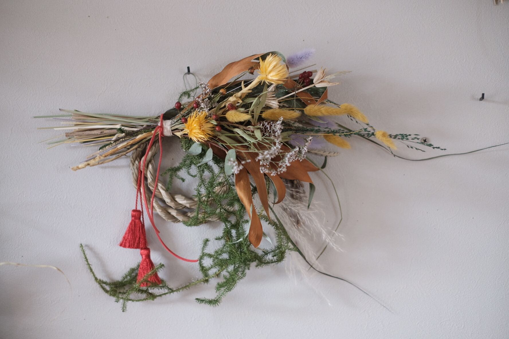 プリザーブドフラワーやドライフラワーを使用したナチュラルな雰囲気のお飾りです
