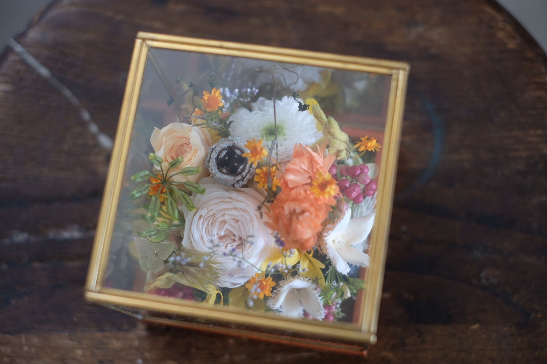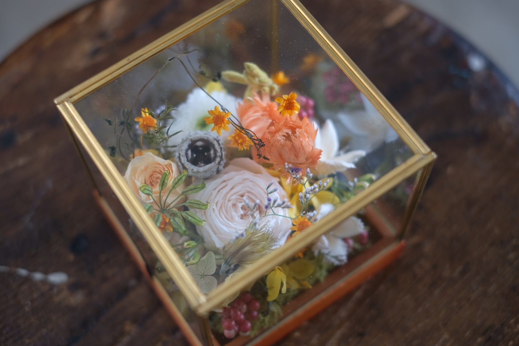 アンティークゴールドの縁取りの綺麗なガラスboxにプリザーブドフラワーフラワーをアレンジしました。