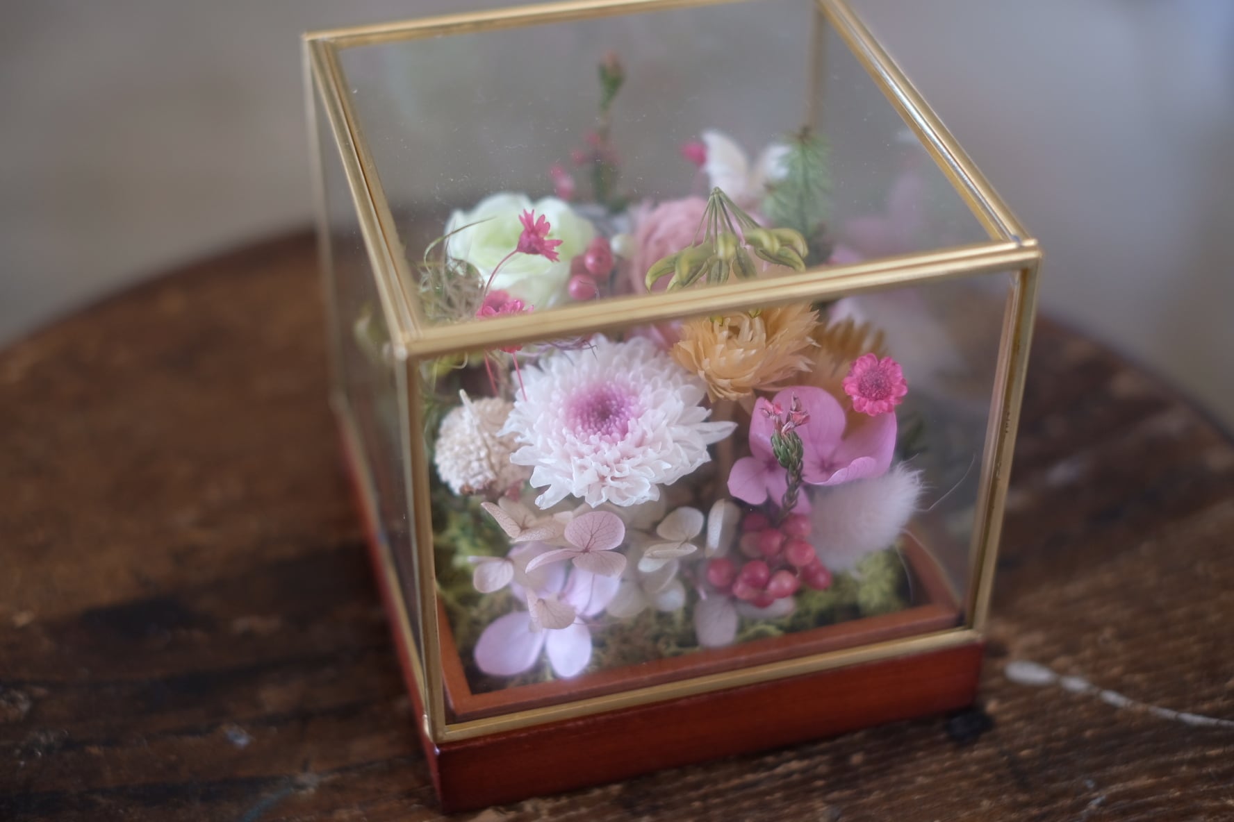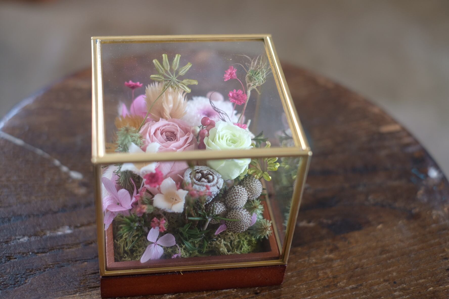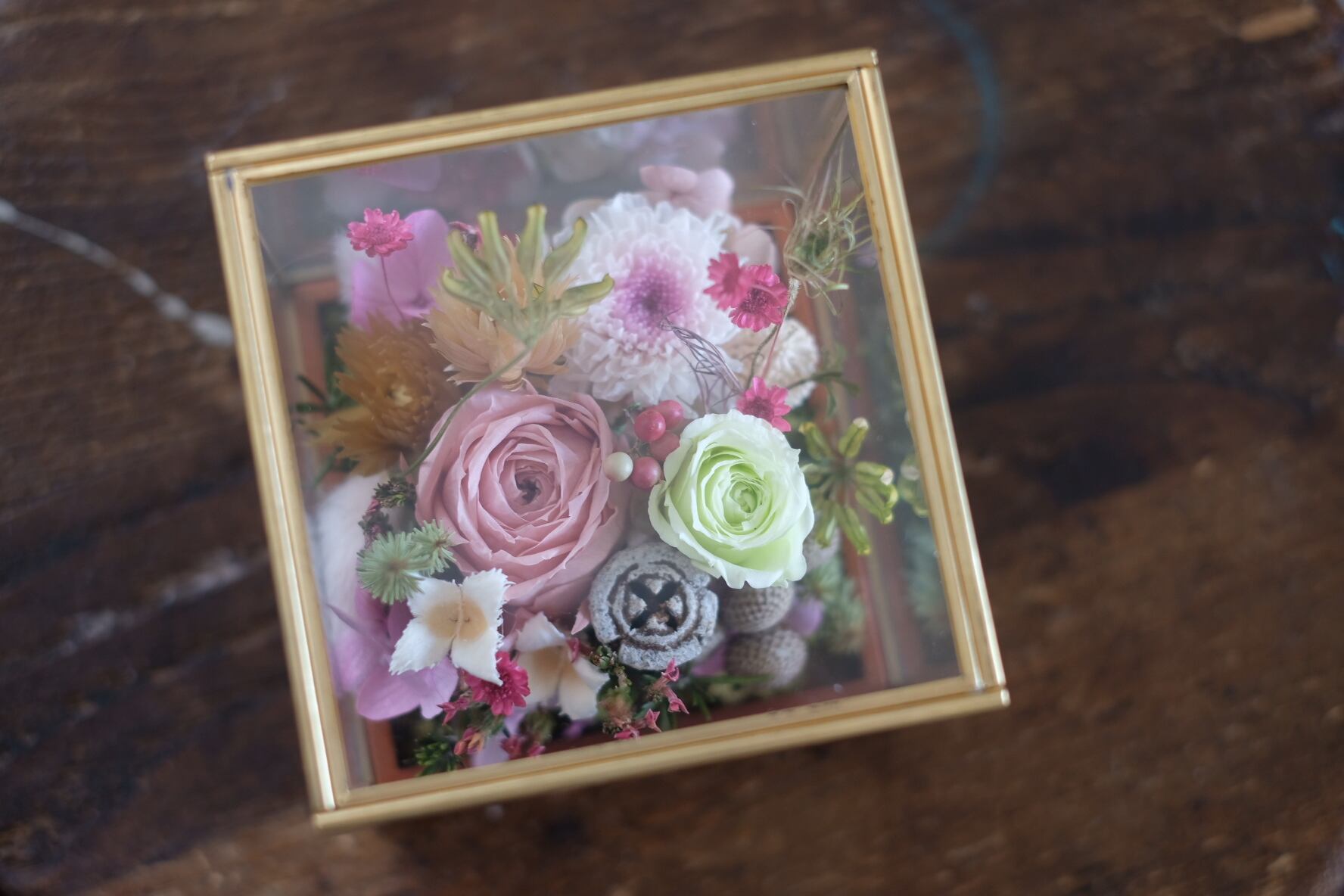 アンティークゴールドの縁取りの綺麗なガラスboxにプリザーブドフラワーフラワーをアレンジしました。