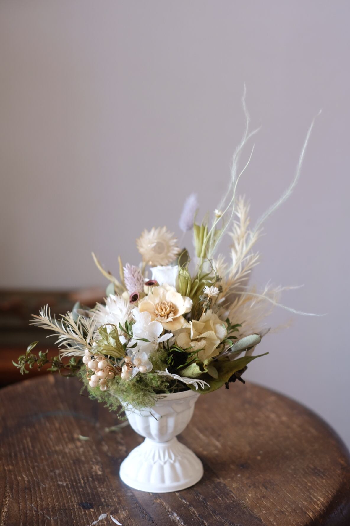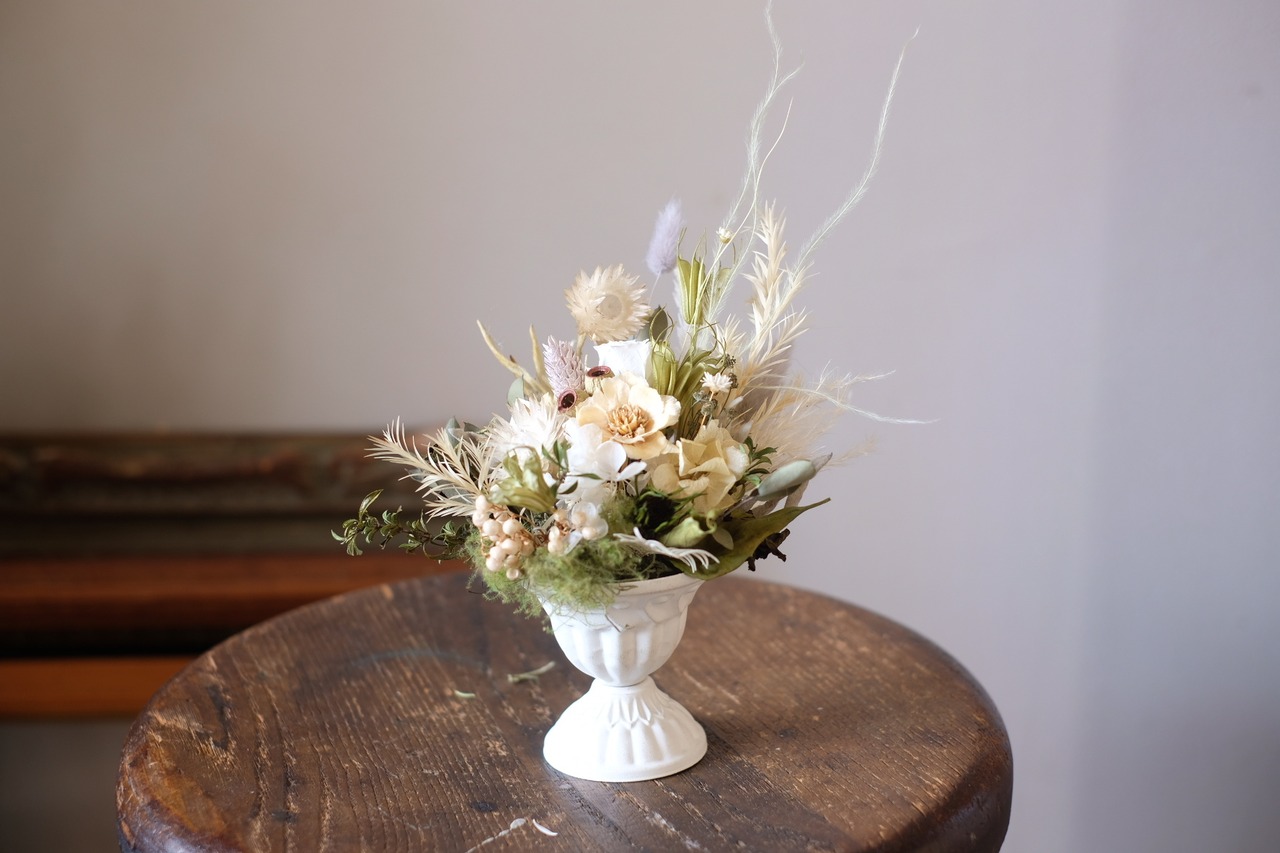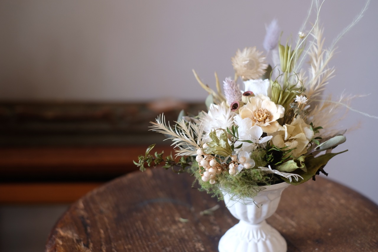 アンティークな雰囲気の器にプリザーブドフラワーのお花をメインにドライフラワーなども混ぜてアレンジしました。柔らかで自然的なイメージなので、ナチュラルなインテリアにも合わせやすいです。