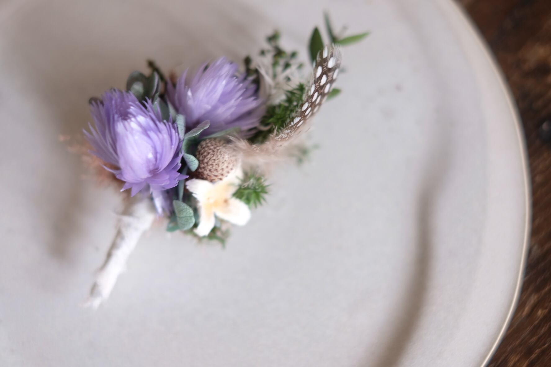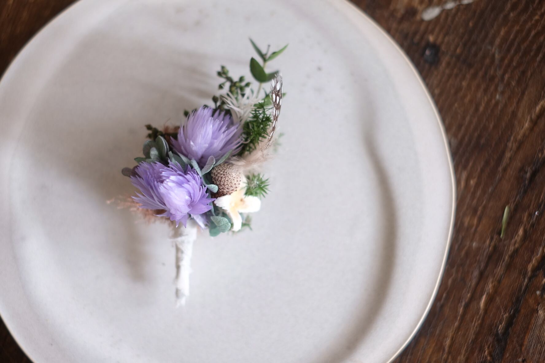 プリザーブドフラワーのお花やアジサイなど本物の植物を加工したものを使用したブローチサイズのコサージュです。