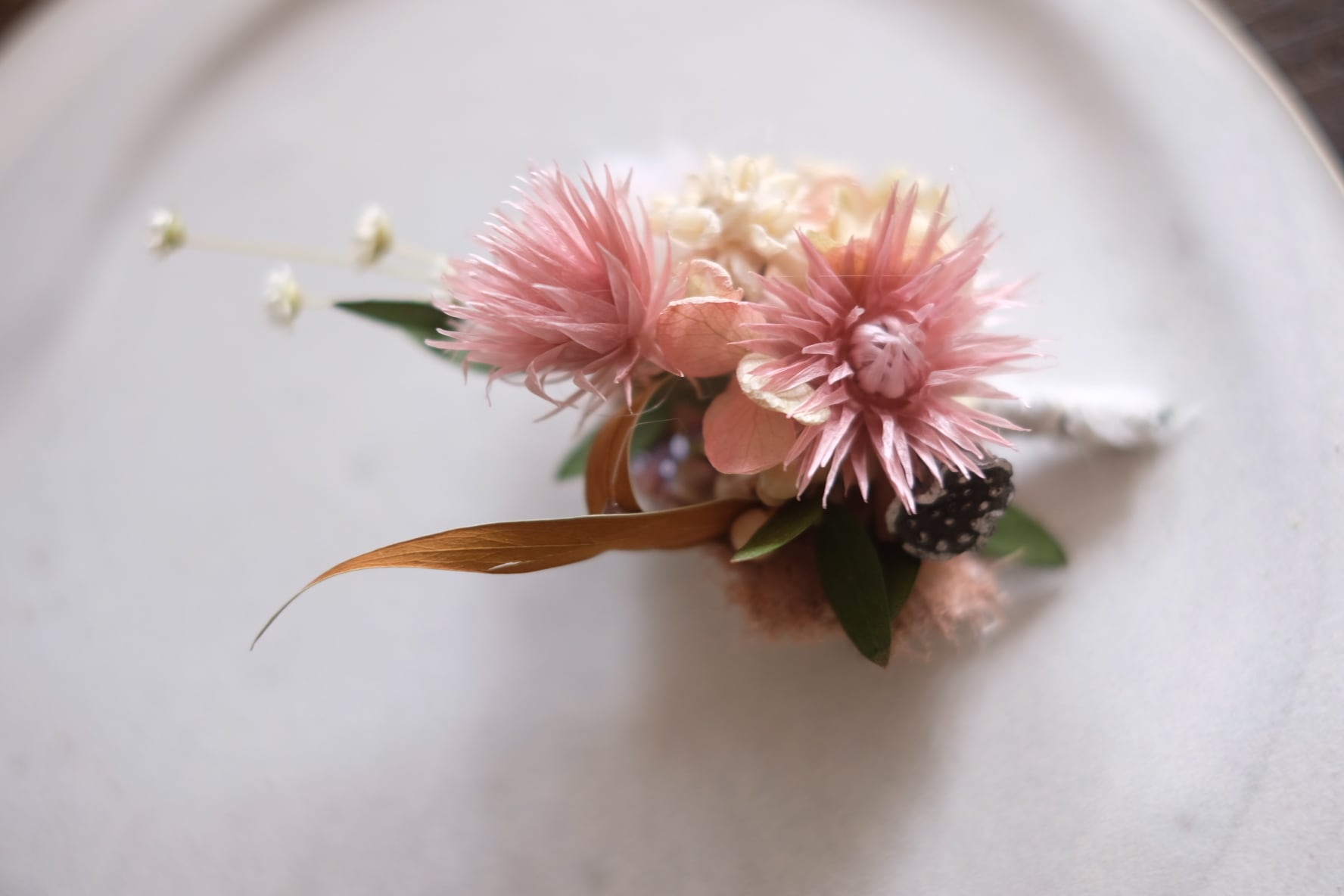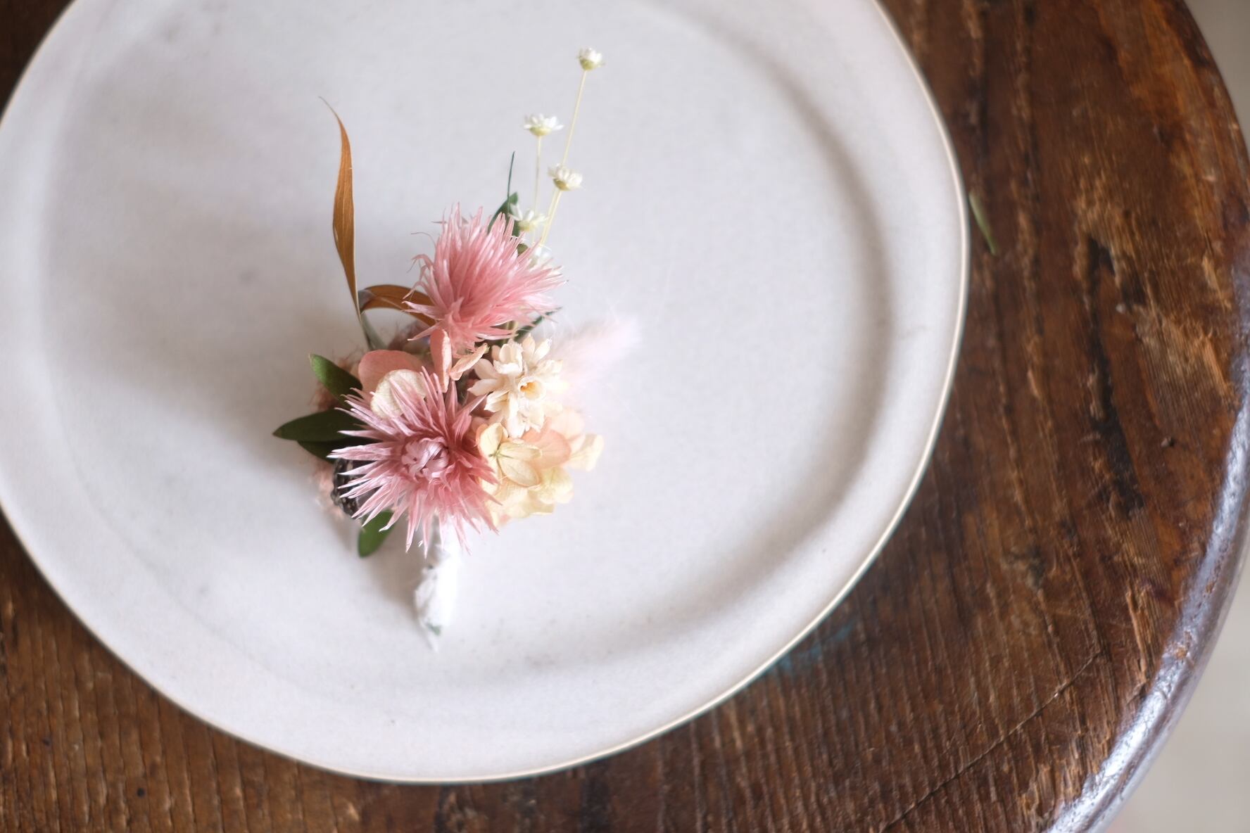 プリザーブドフラワーのお花やアジサイなど本物の植物を加工したものを使用したブローチサイズのコサージュです。