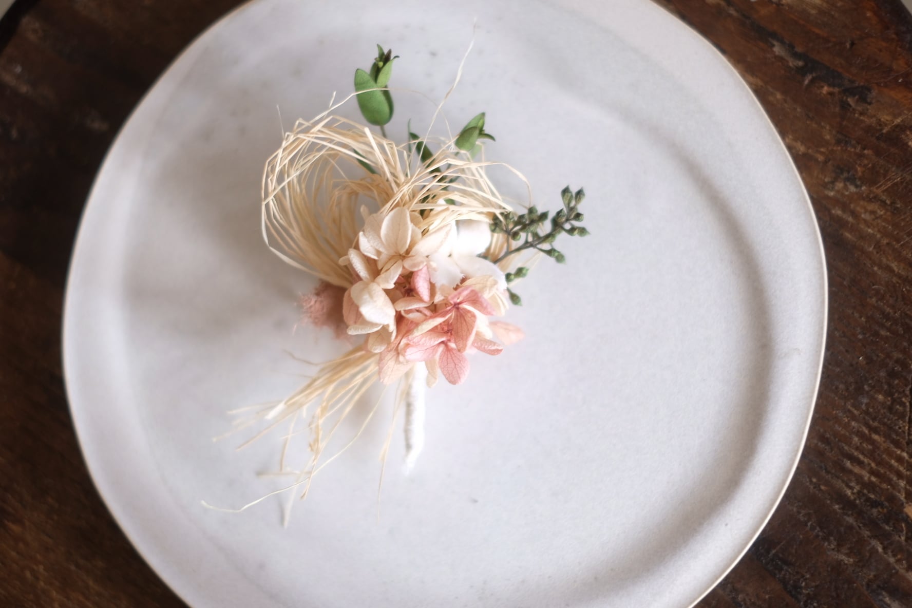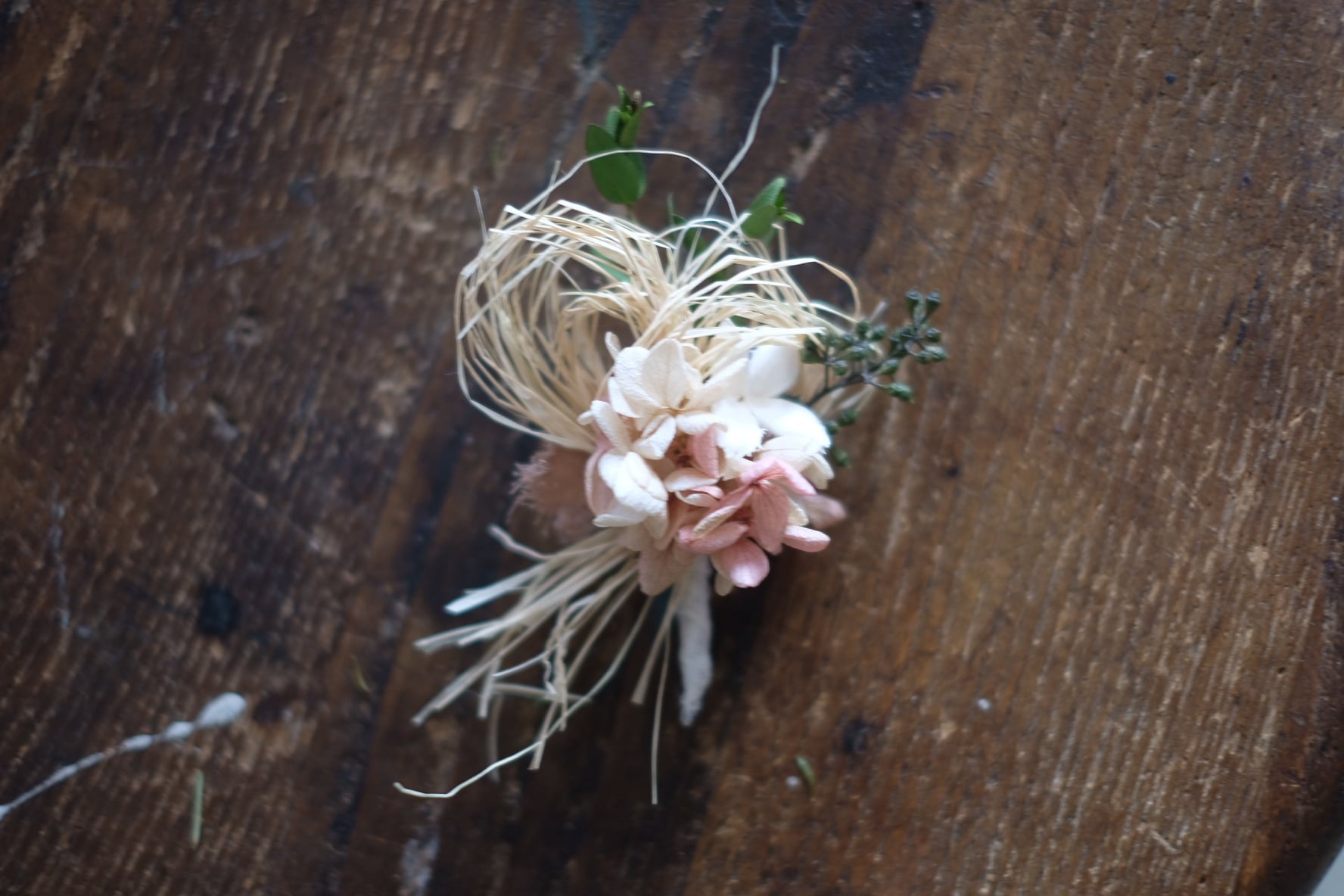 プリザーブドフラワーのお花やアジサイなど本物の植物を加工したものを使用したブローチサイズのコサージュです。