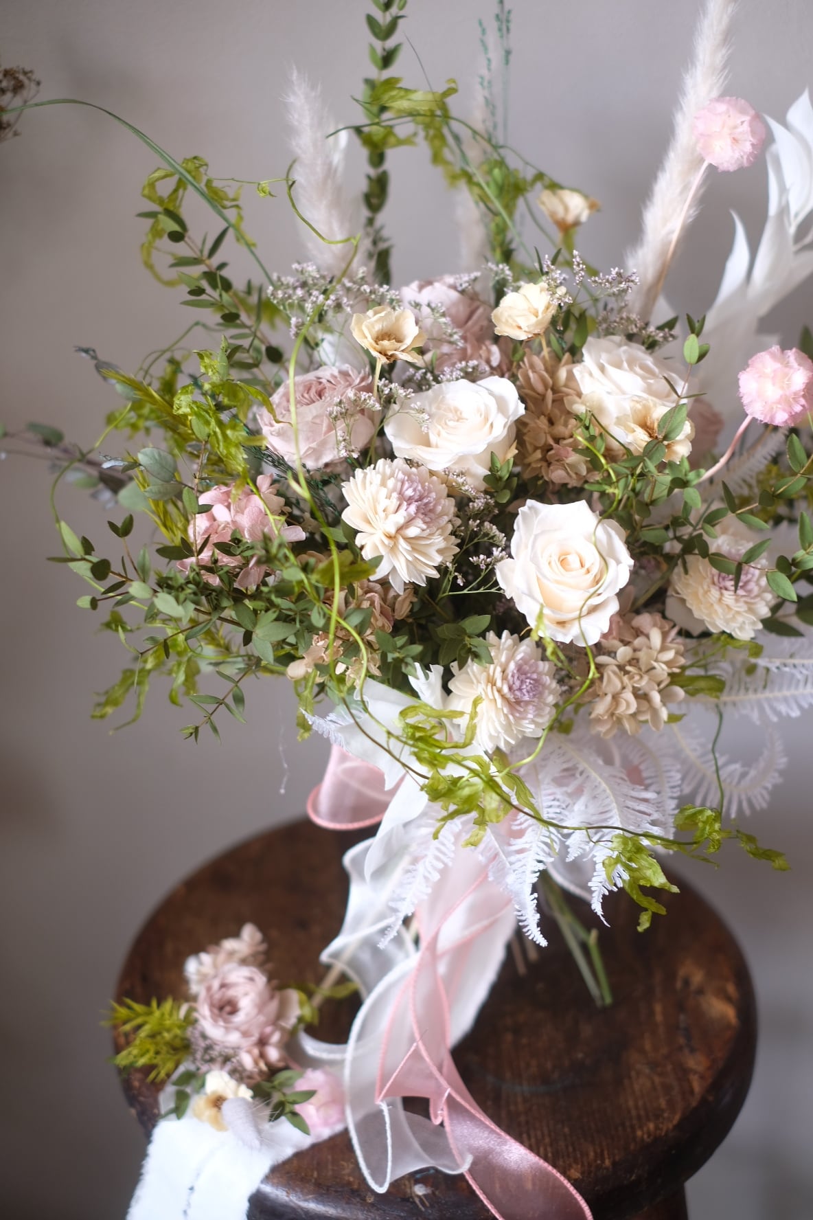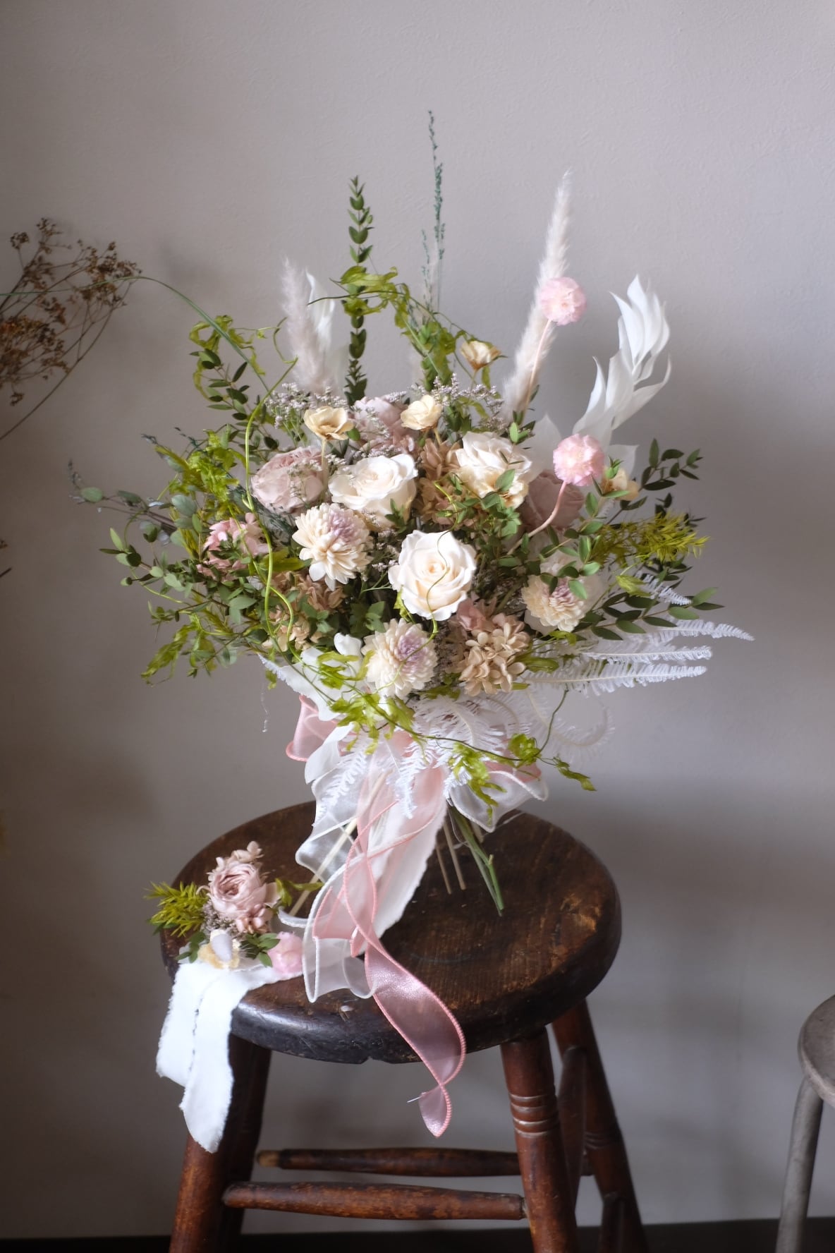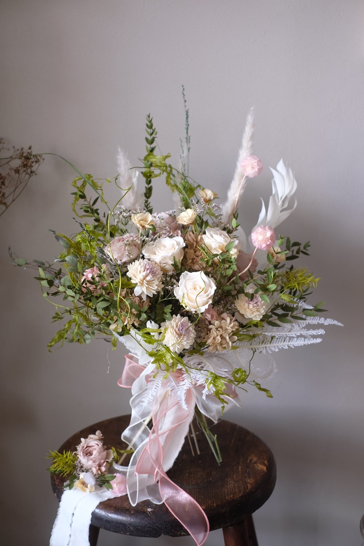 プリザーブドフラワーとドライフラワーの花材を使ったキナリ×グリーンのブーケとブートニアのセットです。