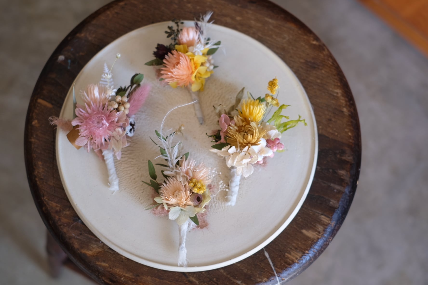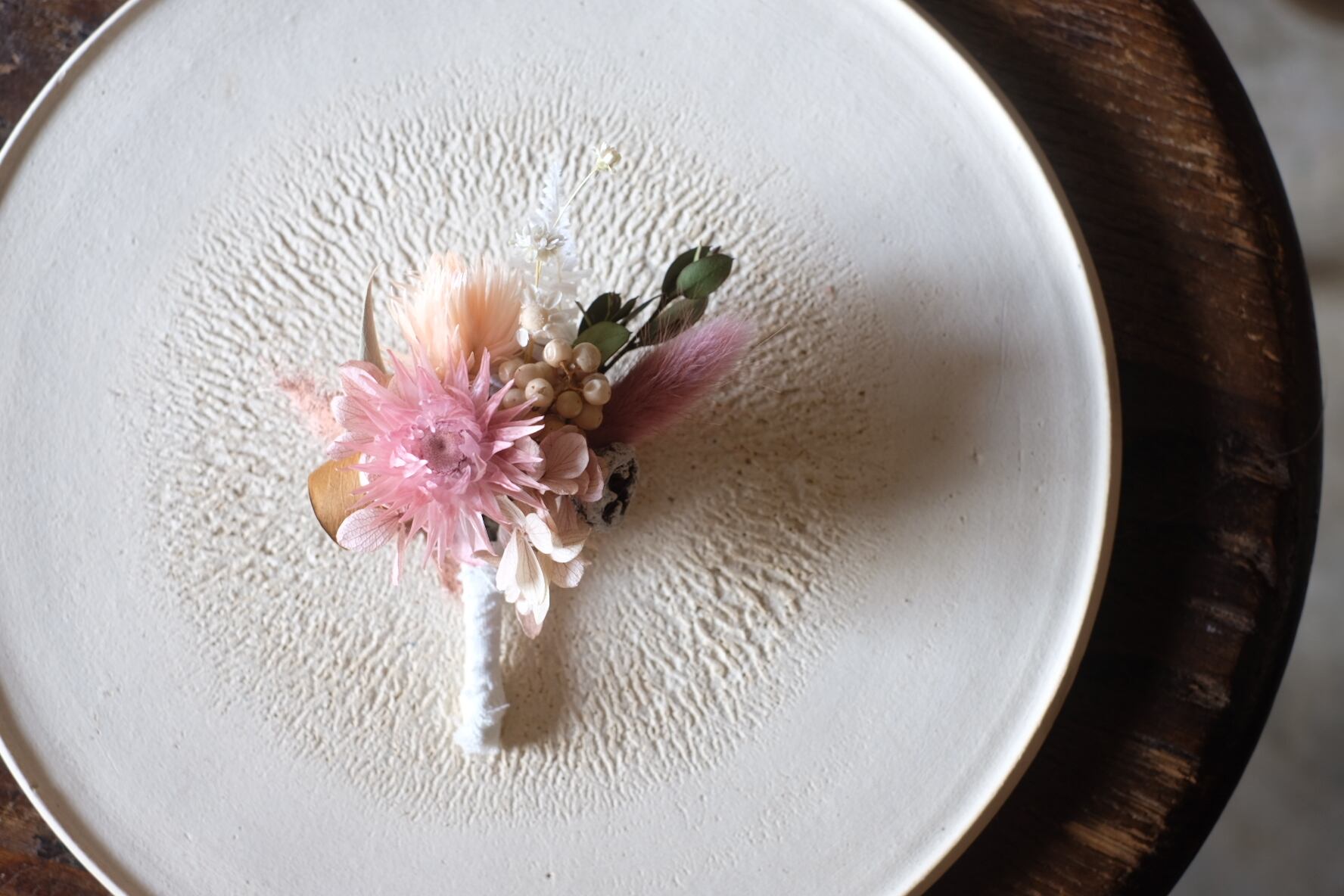 プリザーブドフラワーとドライフラワーの花材を使ったミニコサージュです。