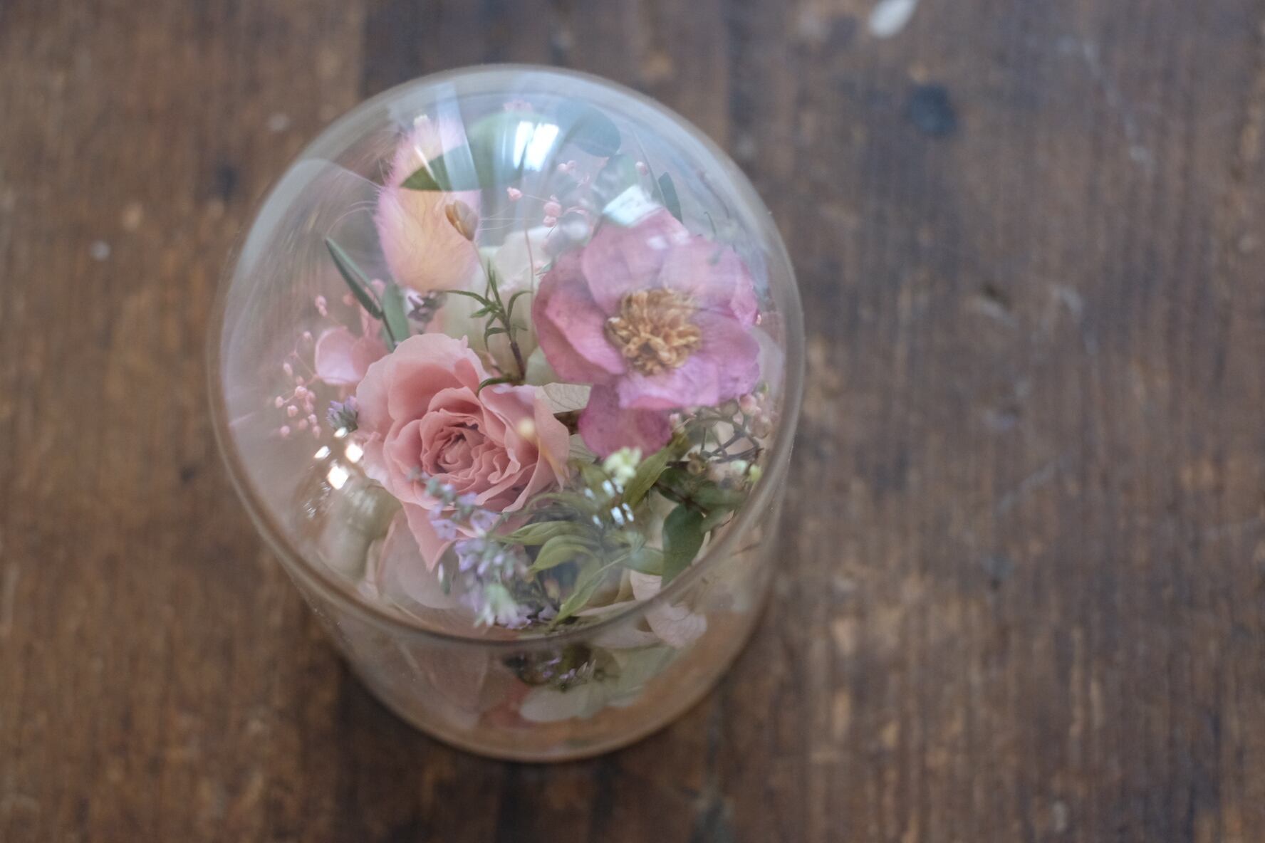 ガラスのドームの中にプリザーブドフラワーフラワーをぎゅっと閉じ込めたようなアレンジです。