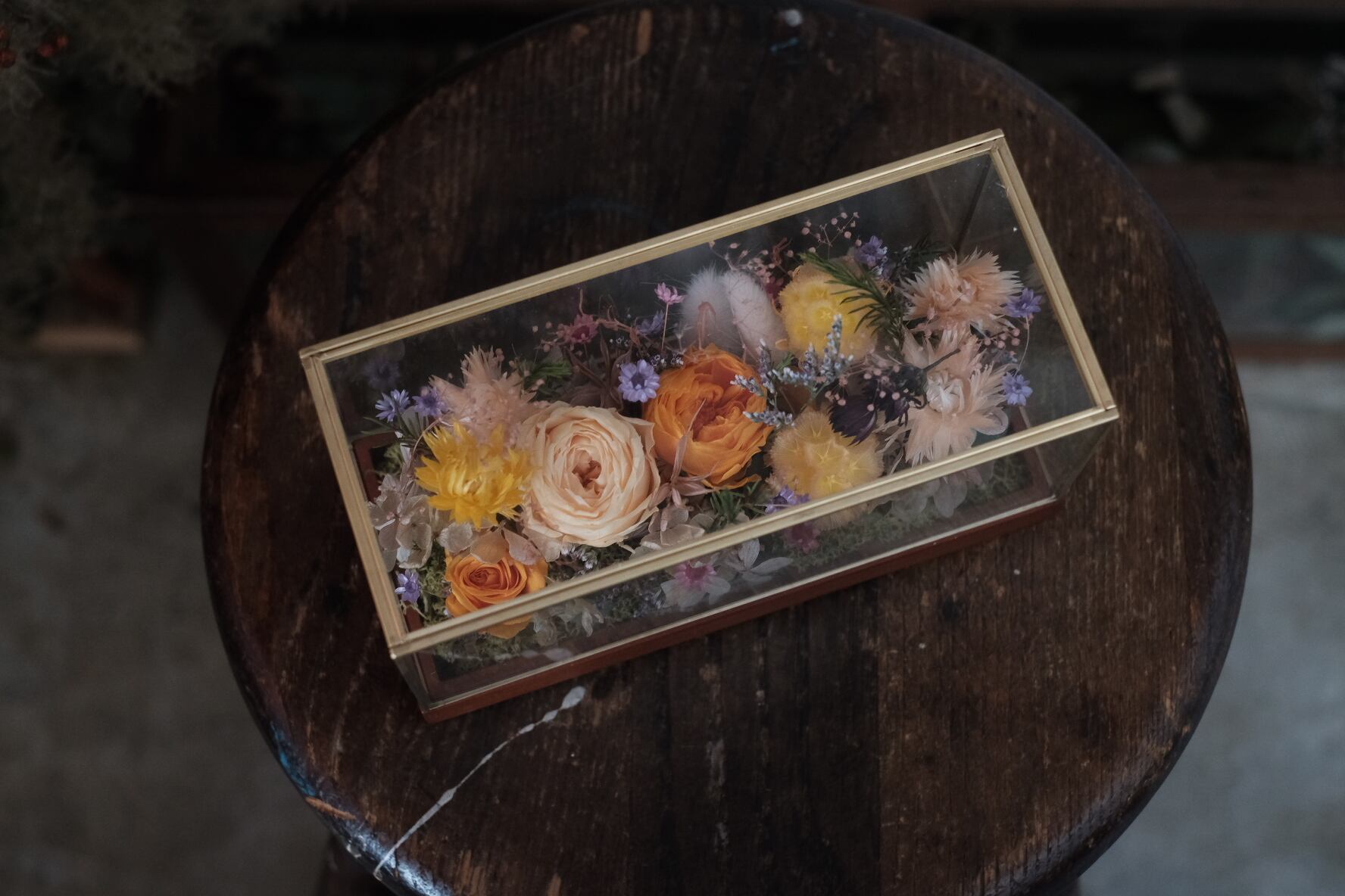アンティークゴールドの縁取りの綺麗なガラスboxにプリザーブドフラワーフラワーをアレンジしました。