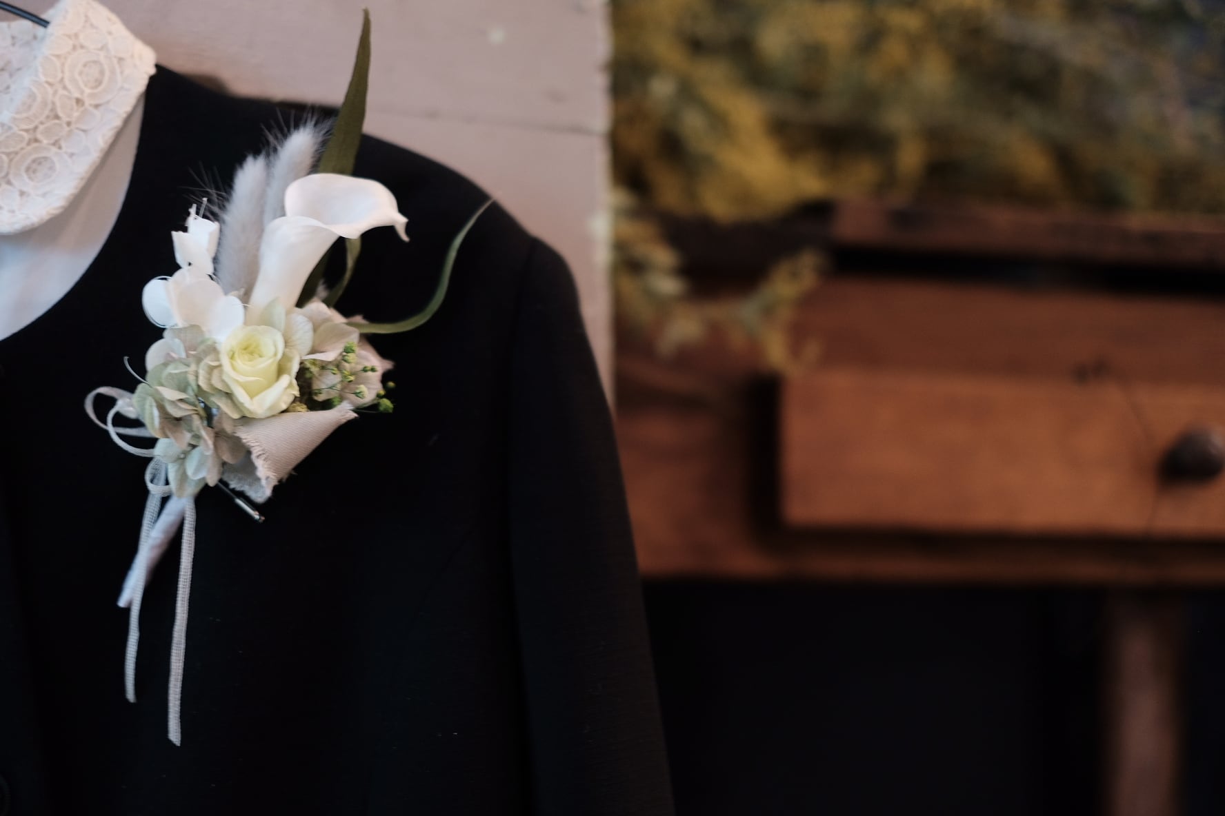 プリザーブドフラワーのカラーやローズ、アジサイ、葉物など本物の植物を加工したものを使用したコサージュです。