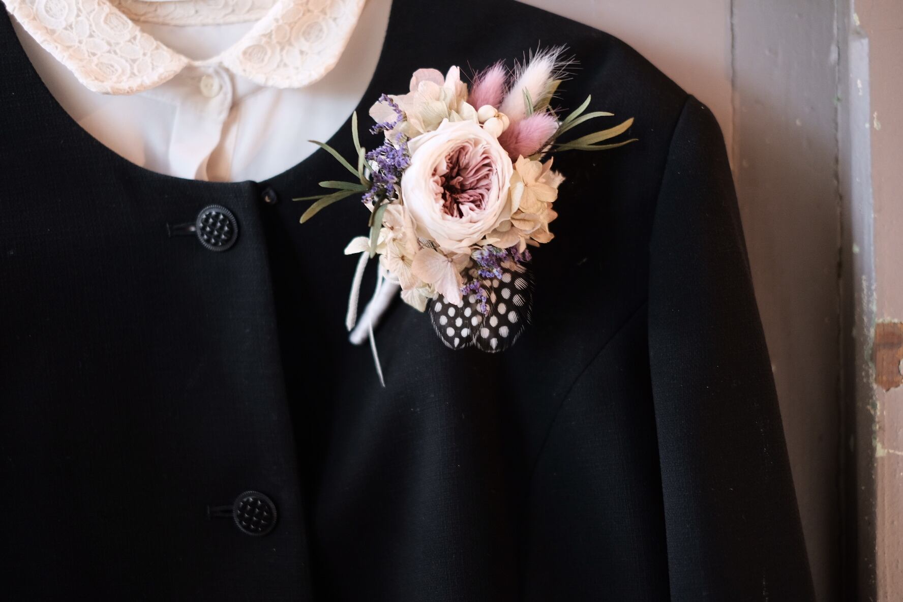 (プリザーブドフラワーは安全ピンで着けると花の重みでお花の顔が下を向いてしまいますので、コサージュピンのほうがおすすめです