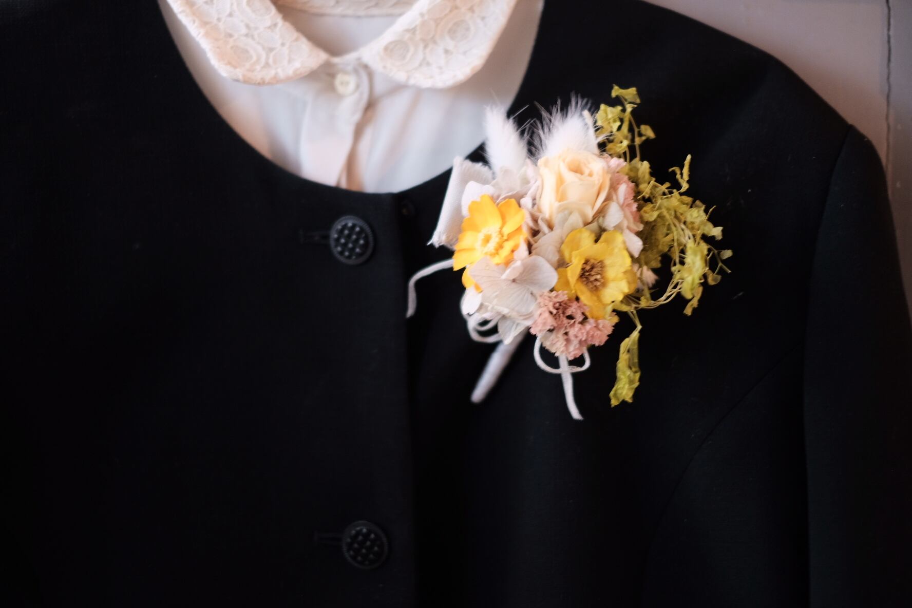 (プリザーブドフラワーは安全ピンで着けると花の重みでお花の顔が下を向いてしまいますので、コサージュピンのほうがおすすめです