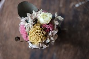 程よいサイズと華やかさのアレンジは、ニッチやデスクの上などにちょこんと飾りやすく、気軽にお花の彩りを楽しんでいただけます。