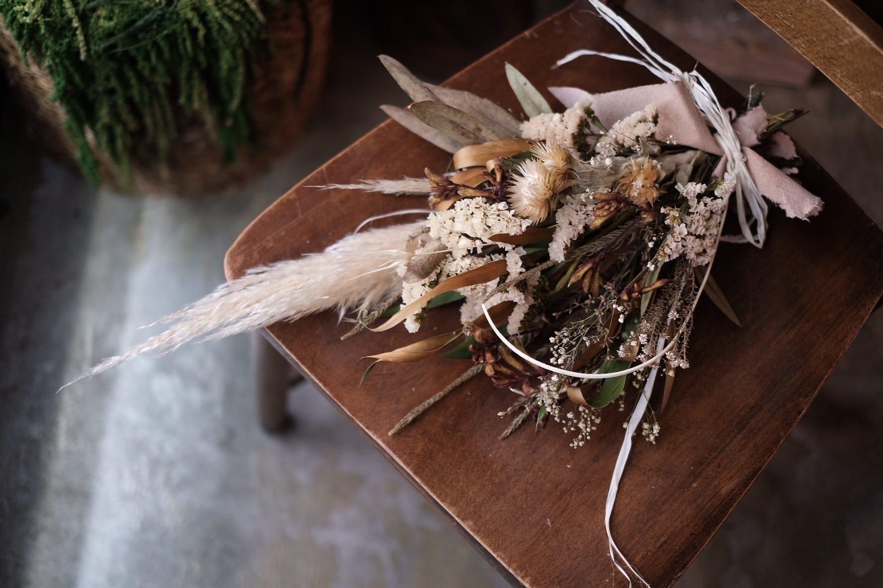こちらの商品はキナリ色の小花やベージュの葉物、パンパスグラスなどを束ねたナチュラルな雰囲気のスワッグになります。