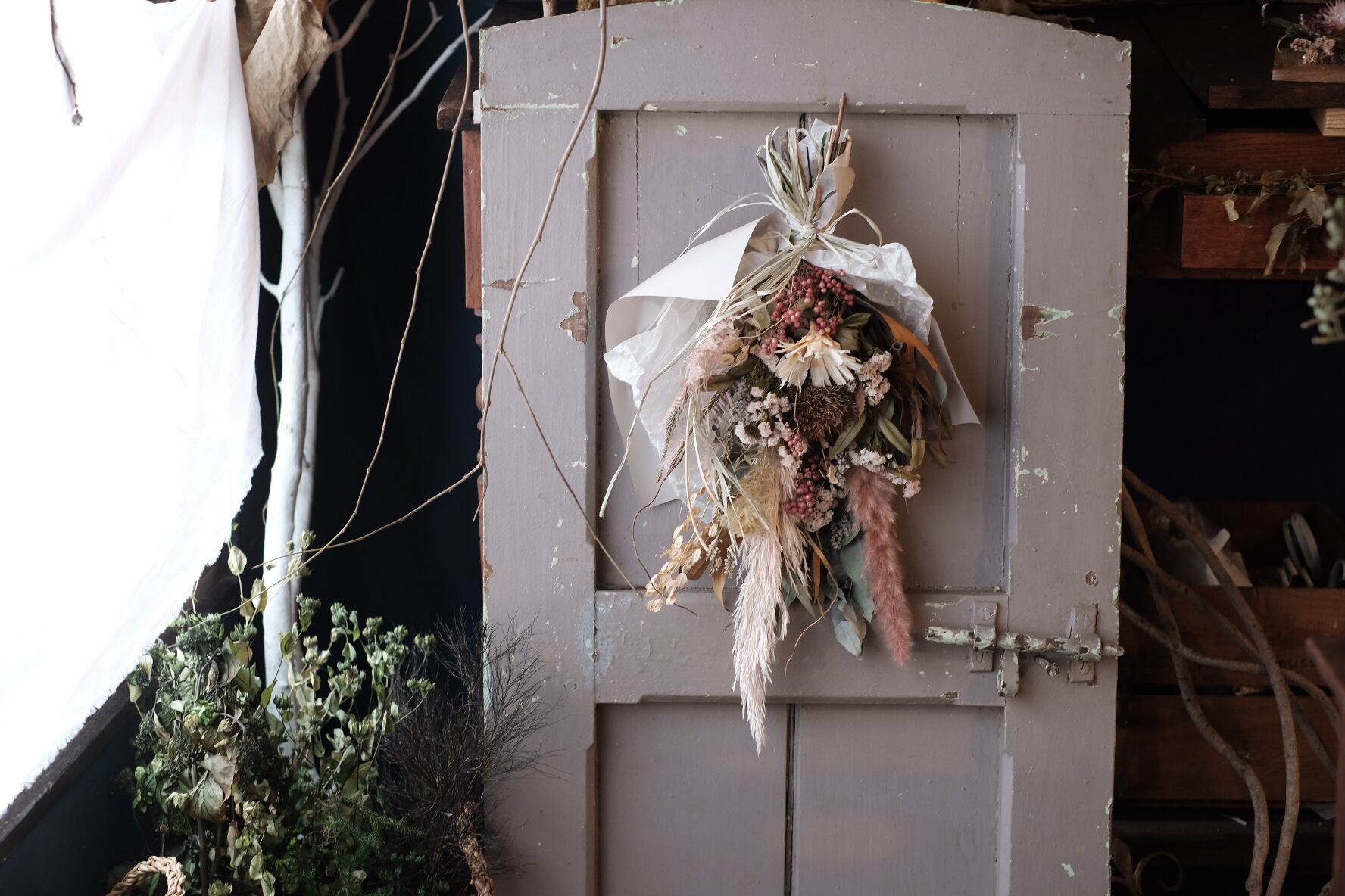 こちらの商品はオリジナル加工したプリザーブドフラワーやドライフラワーを束ねた大きめのスワッグです。柔らかなベージュピンクの穂や小花達にユーカリやペッパーベリーの実などなどを束ねたボリュームのあるスワッグになります。