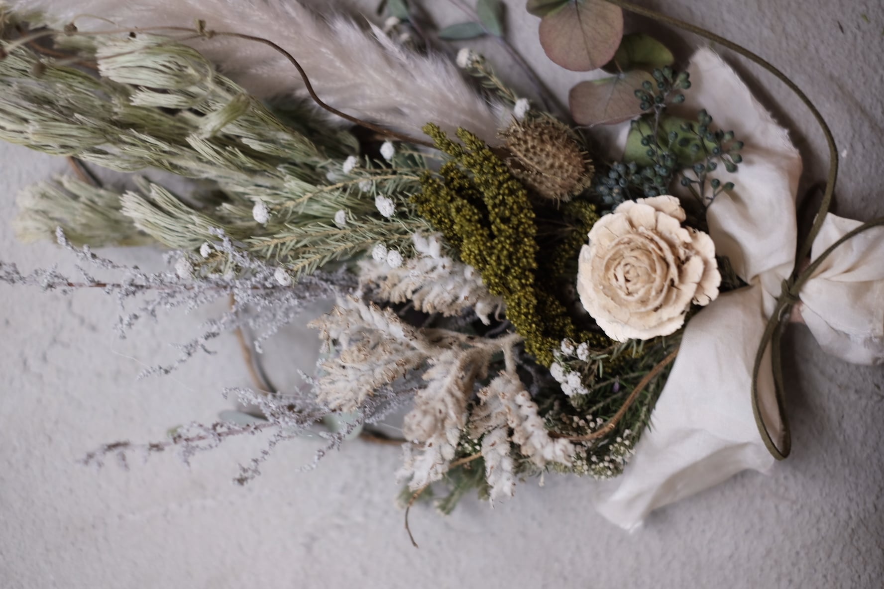 こちらの商品さまざまなプリザーブドフラワーやドライフラワーを組み合わせたスワッグになります。