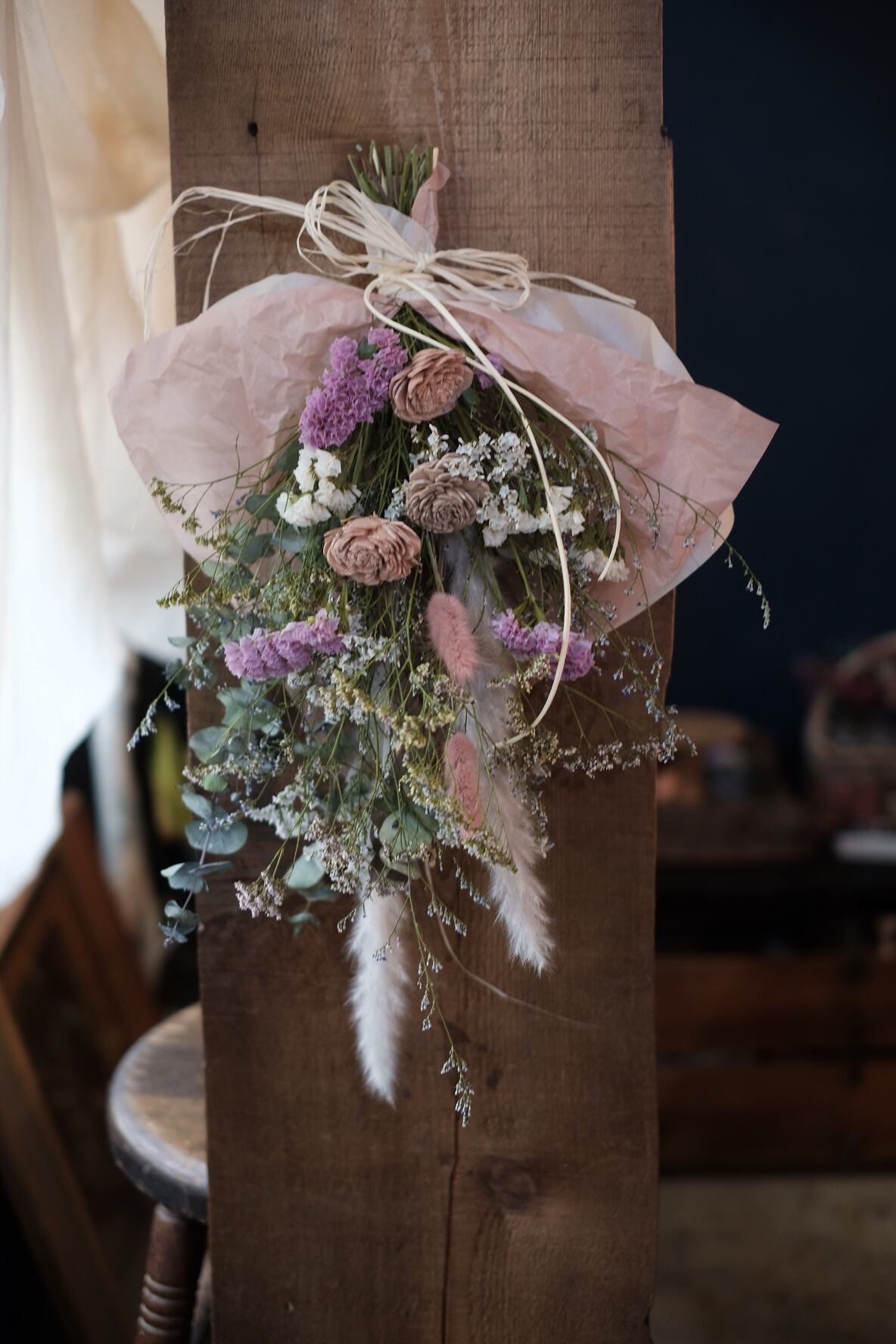 プリザーブドフラワーやドライフラワーなど本物の植物を加工したものを使用したスワッグです。