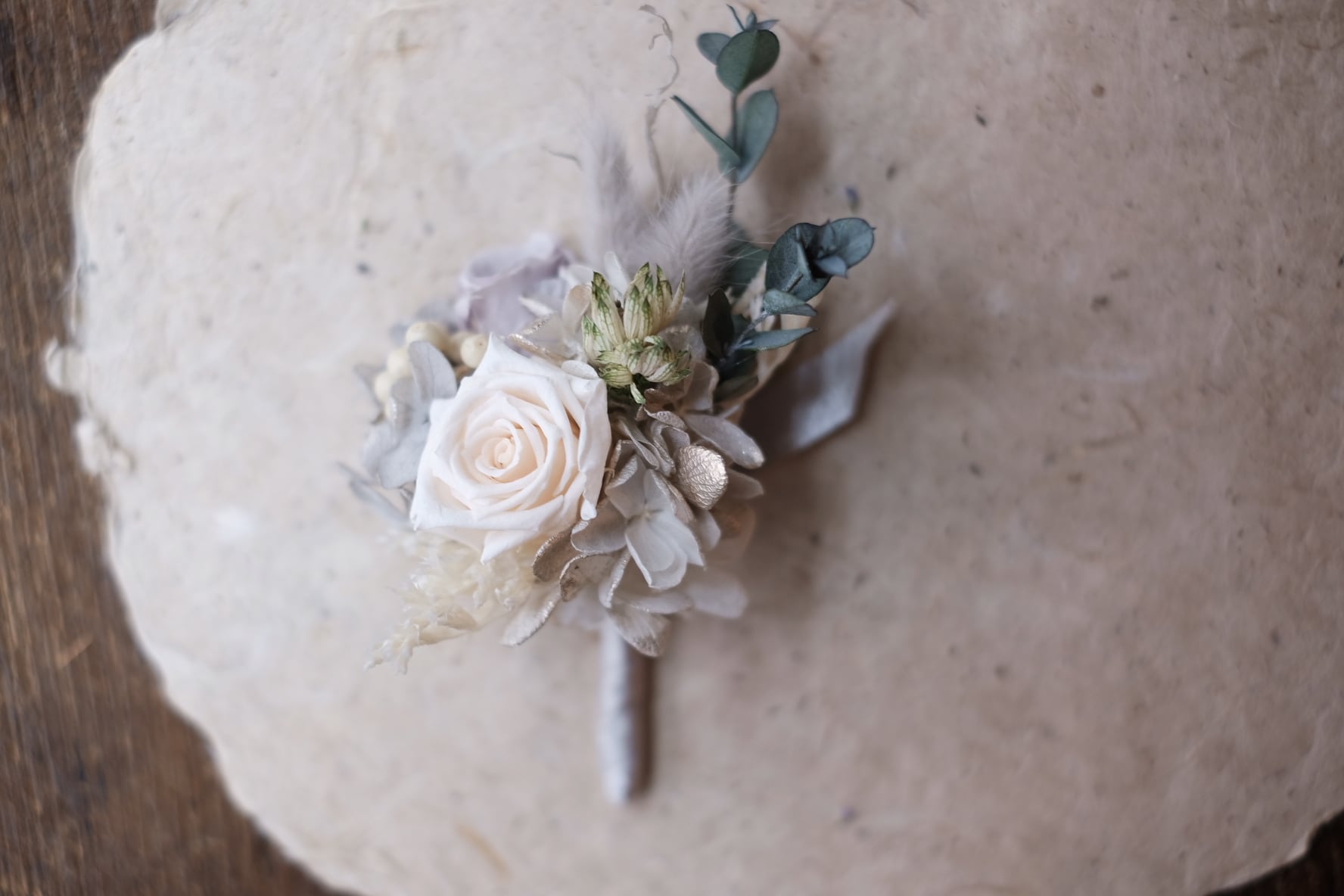 プリザーブドフラワーのローズ、アジサイ、木の実など本物の植物を加工したものを使用したコサージュです。