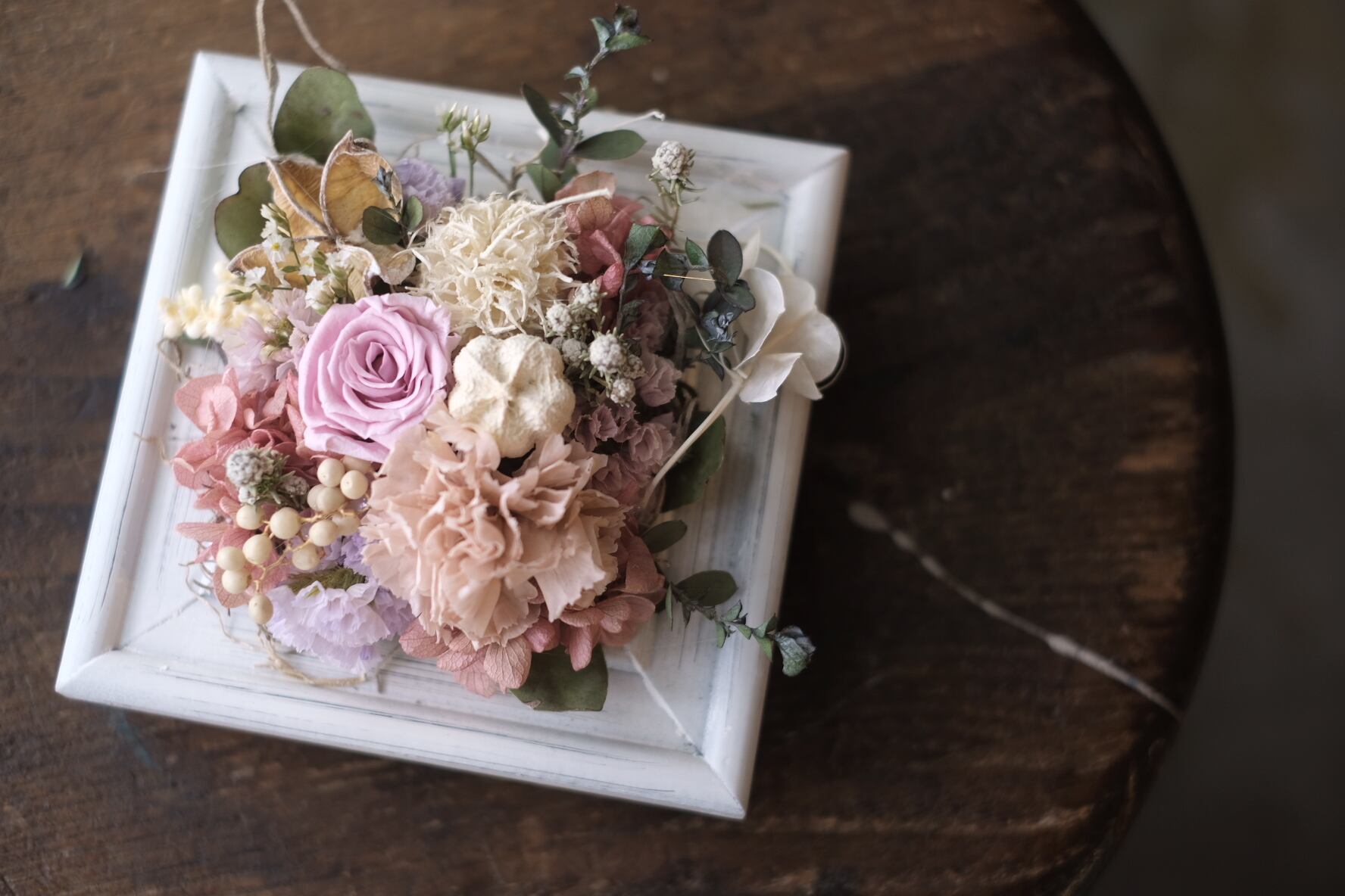 アンティーク調の額にお花をこんもりと添えてアレンジしました。