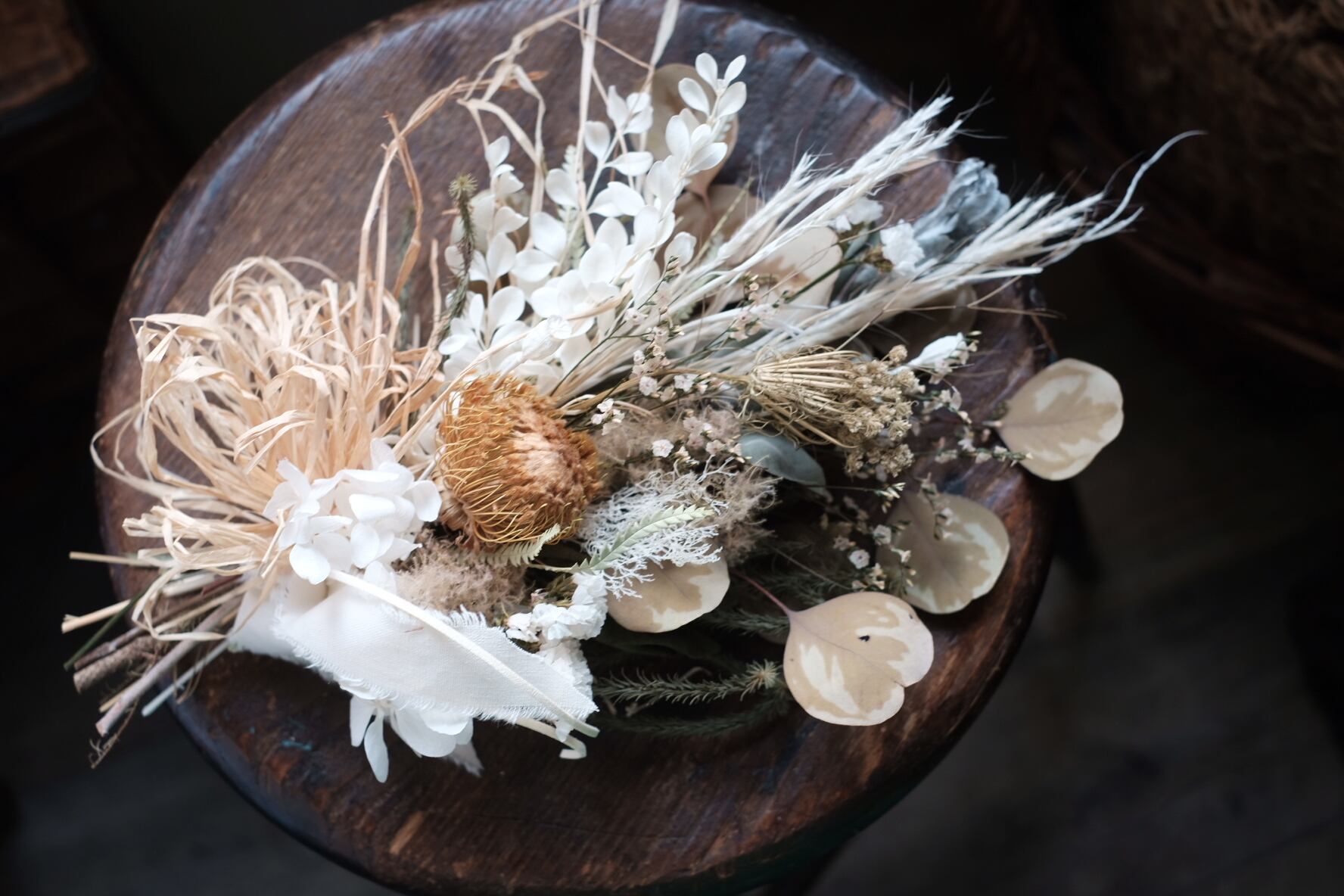 プリザーブドフラワーは生花を保存加工することで、その柔らかな風合いや形を長く楽しめるようにしたものです。まるで生花のような風合いですが、プリザーブドフラワーを使用しているため長く楽しんでいただけます。ただ、自然の素材ですので2~3年ほどで花弁にヒビが入り、お色も退色してきます。そんな移ろいゆく様も自然素材の面白さとして楽しんでいただけたらと思います。